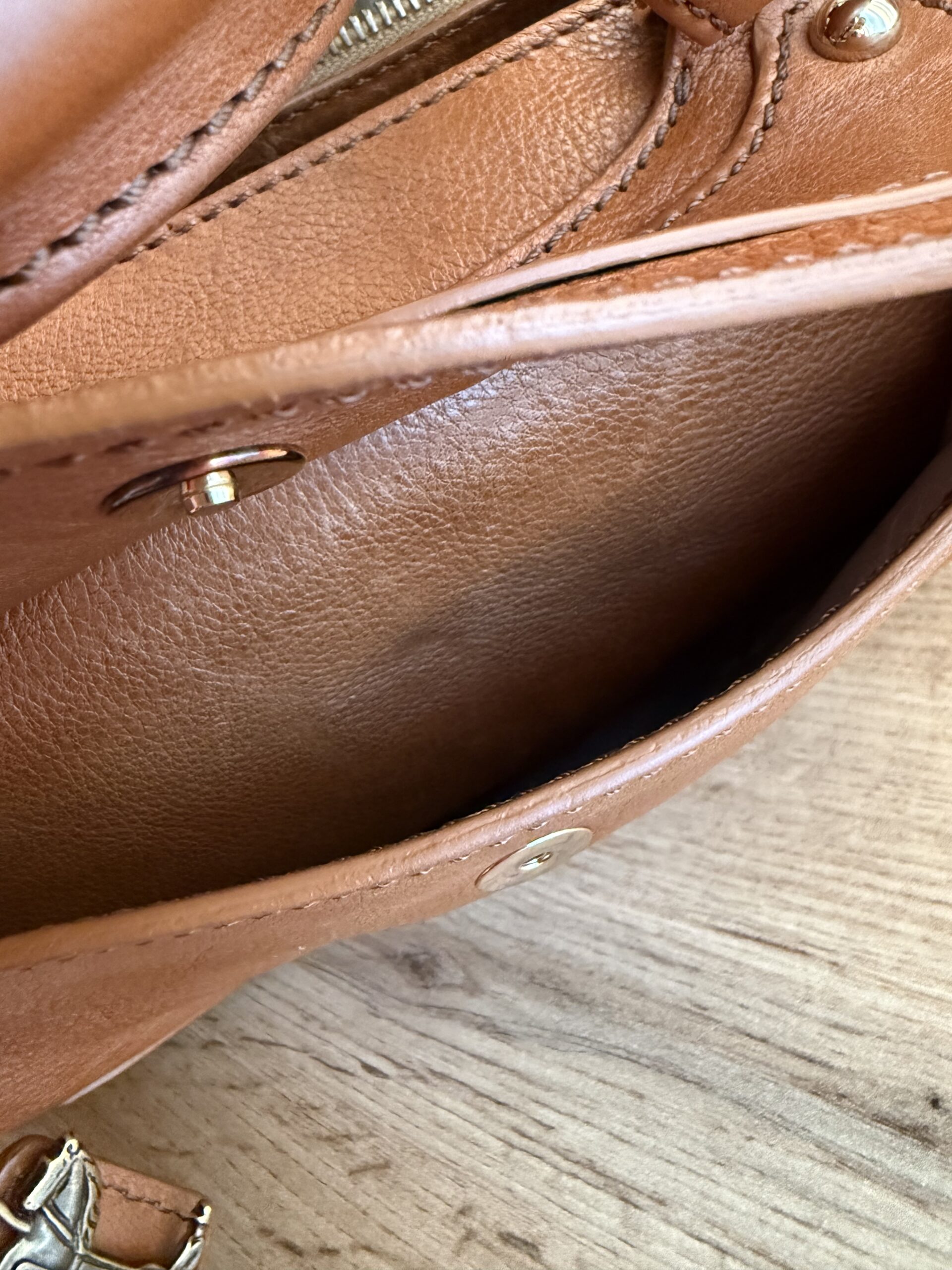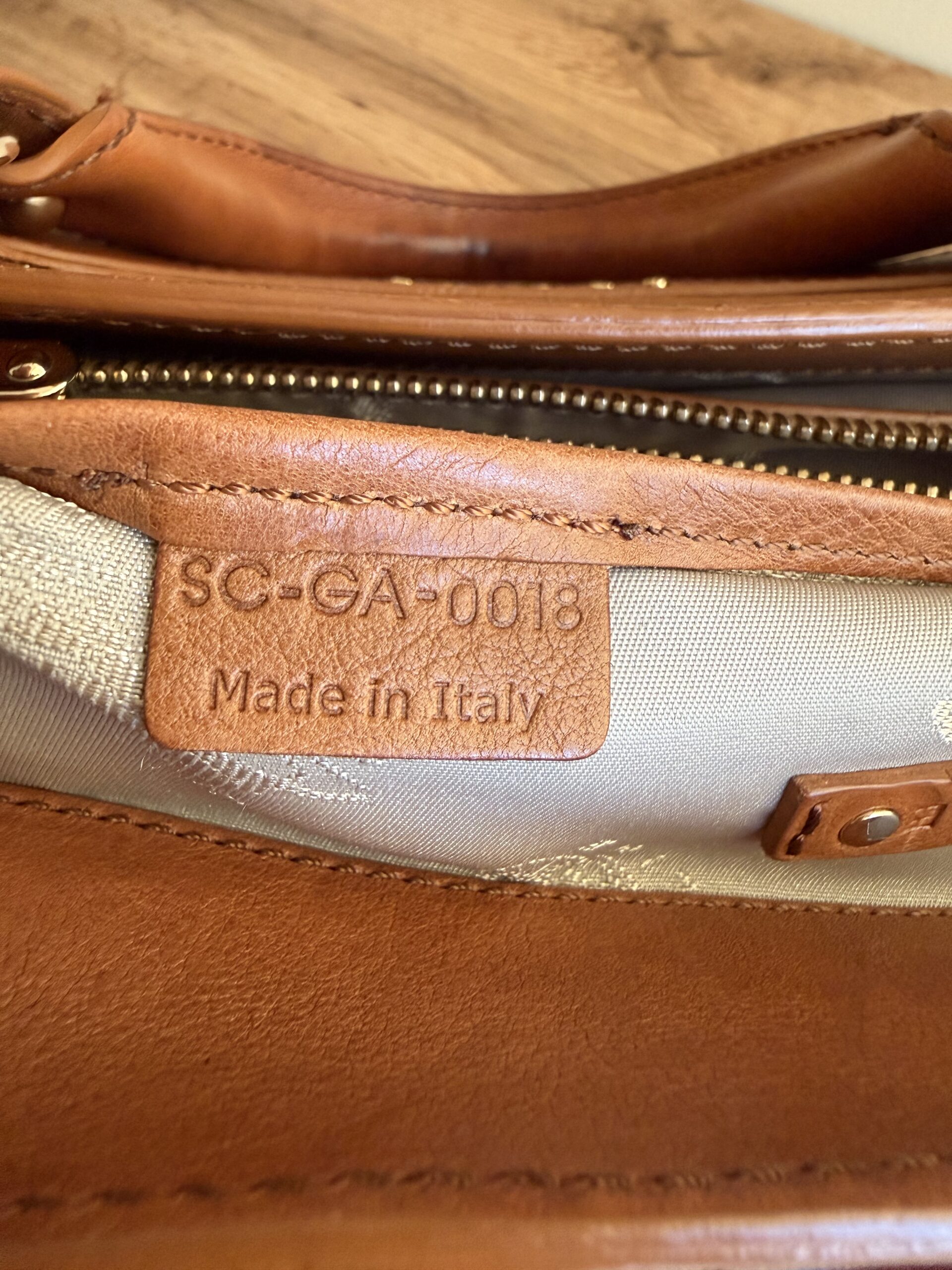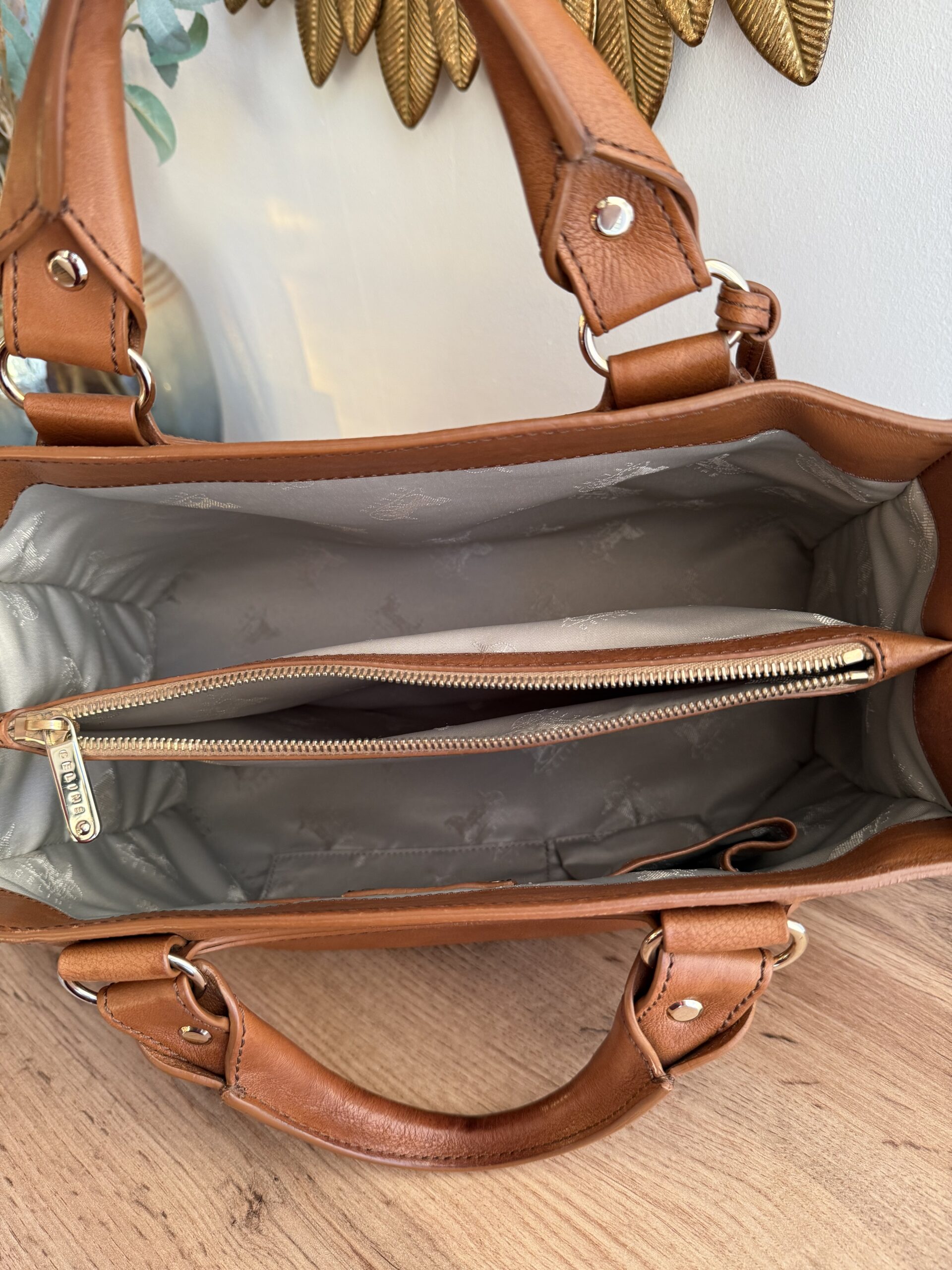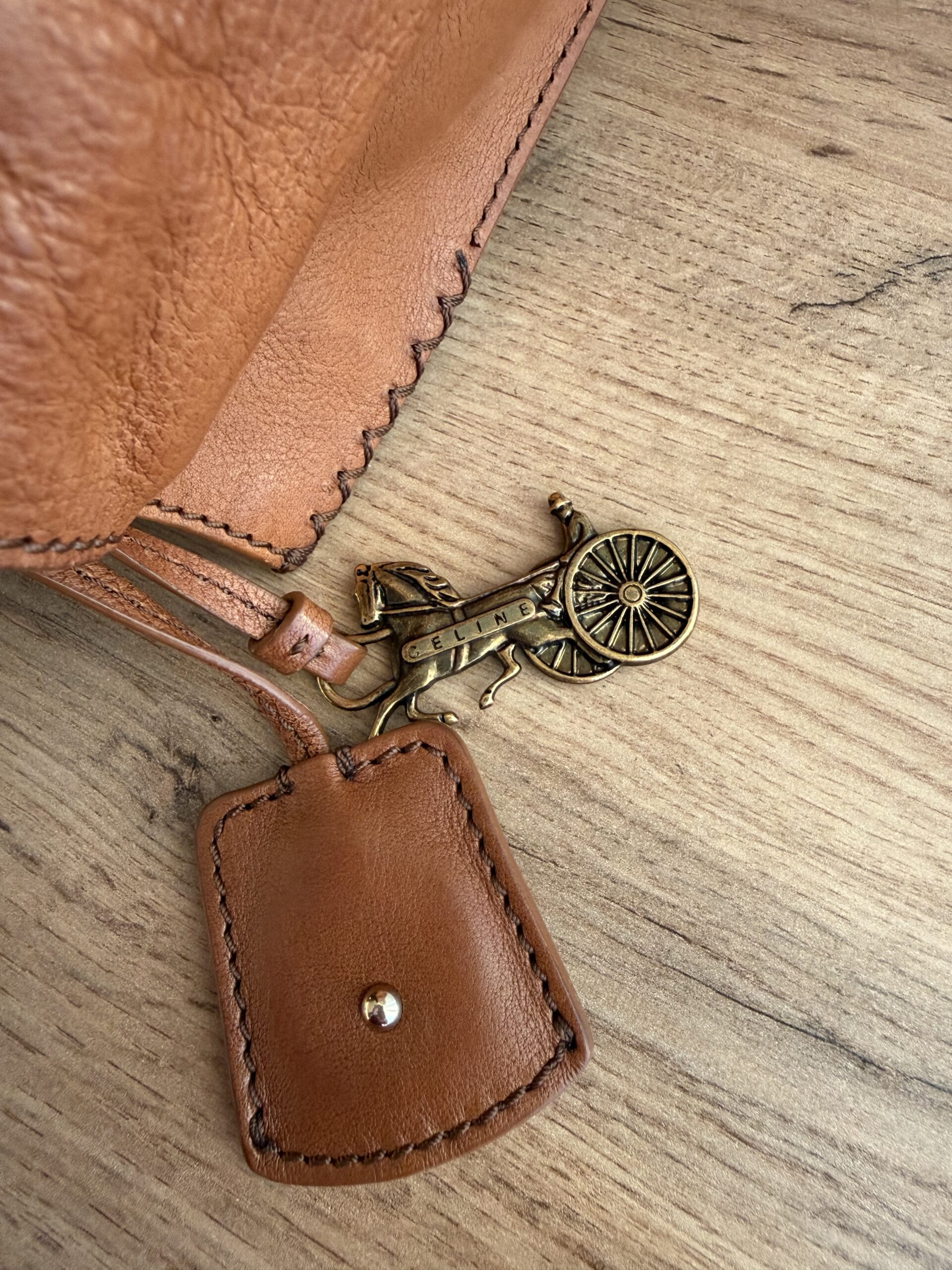 Vintage beauty, this bag is crafted from durable leather. Ideal for everyday use. Features two main compartment and one zipped pocket. This bag comes with the original horse and carriage charm.