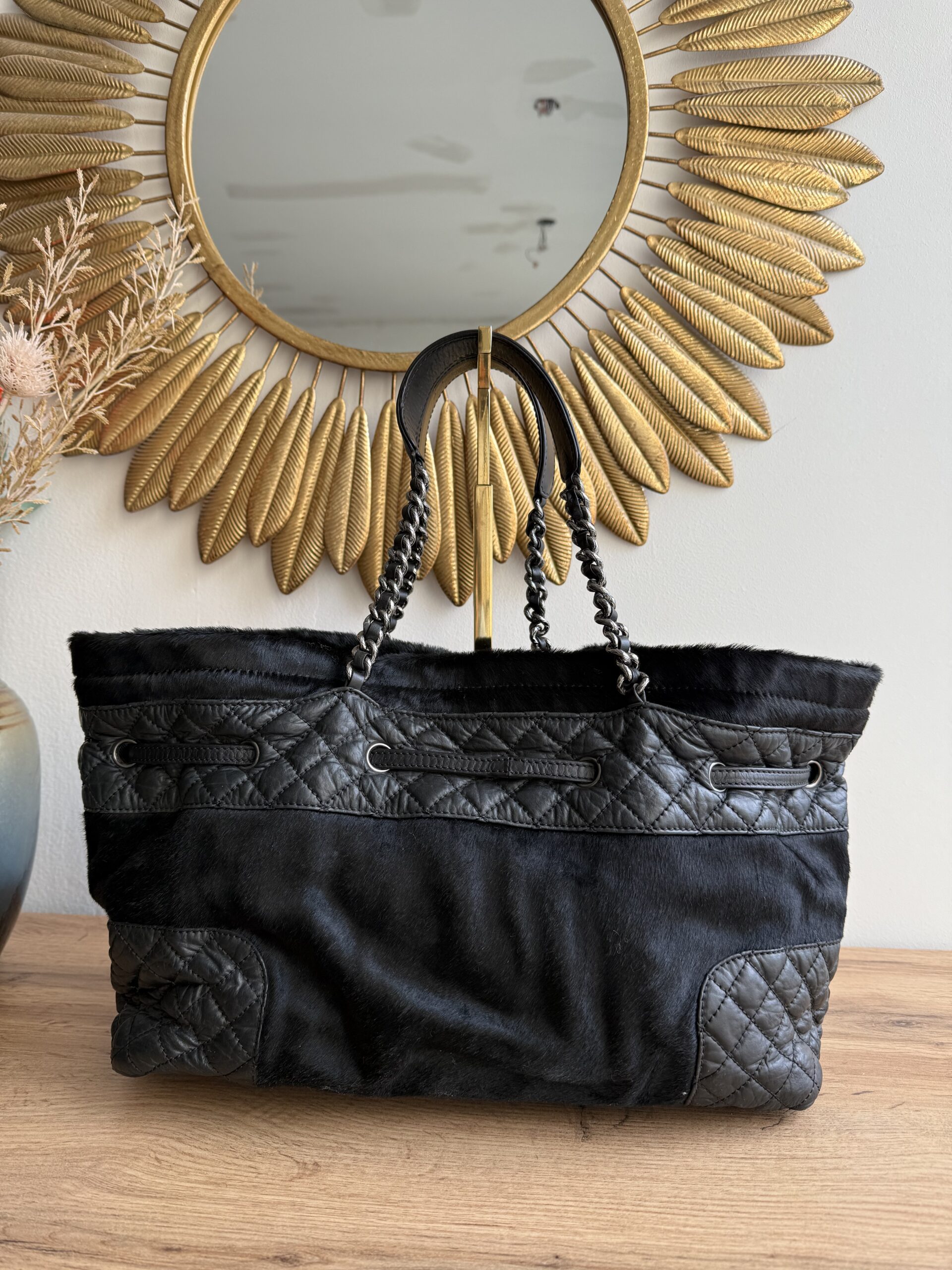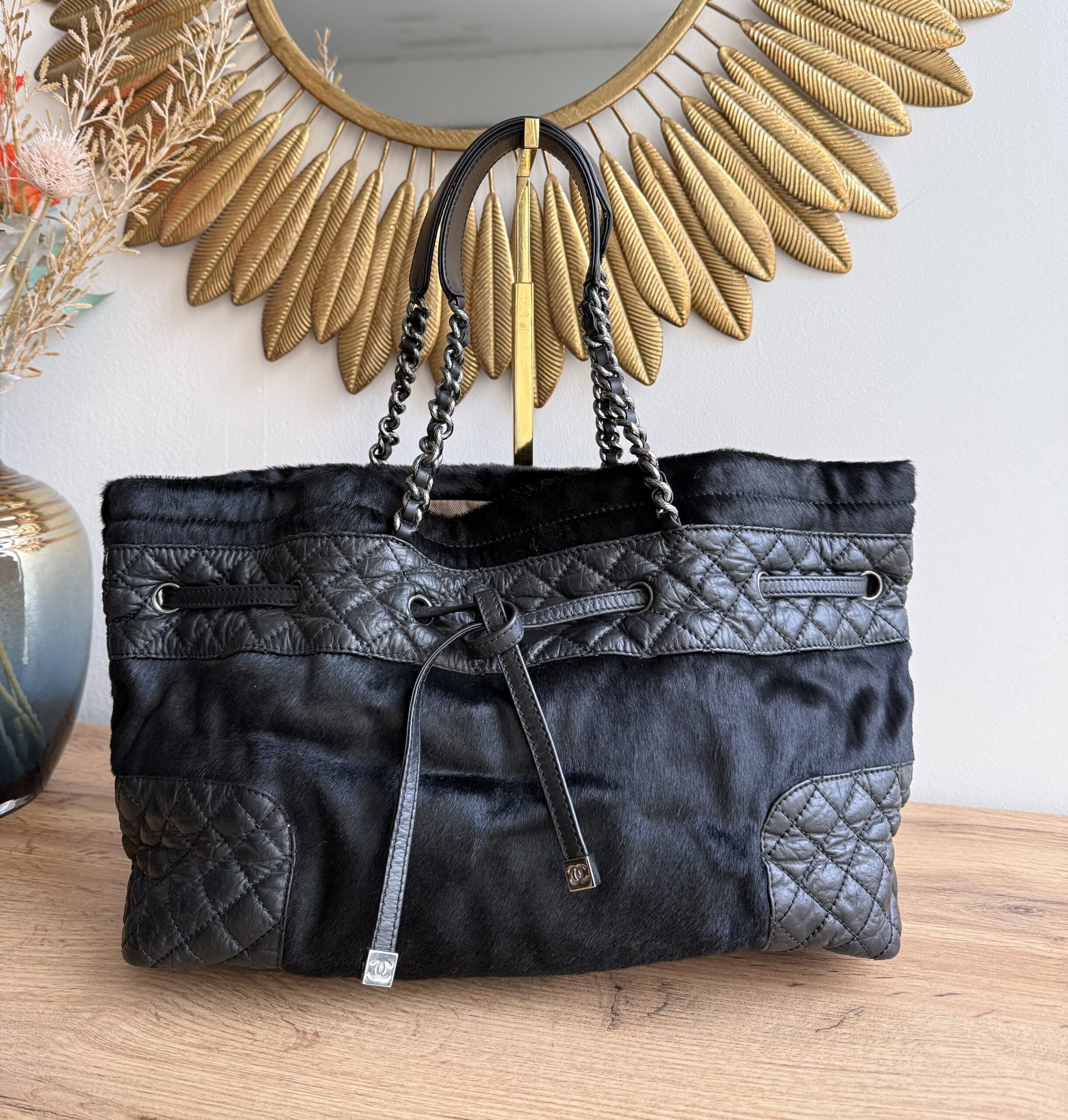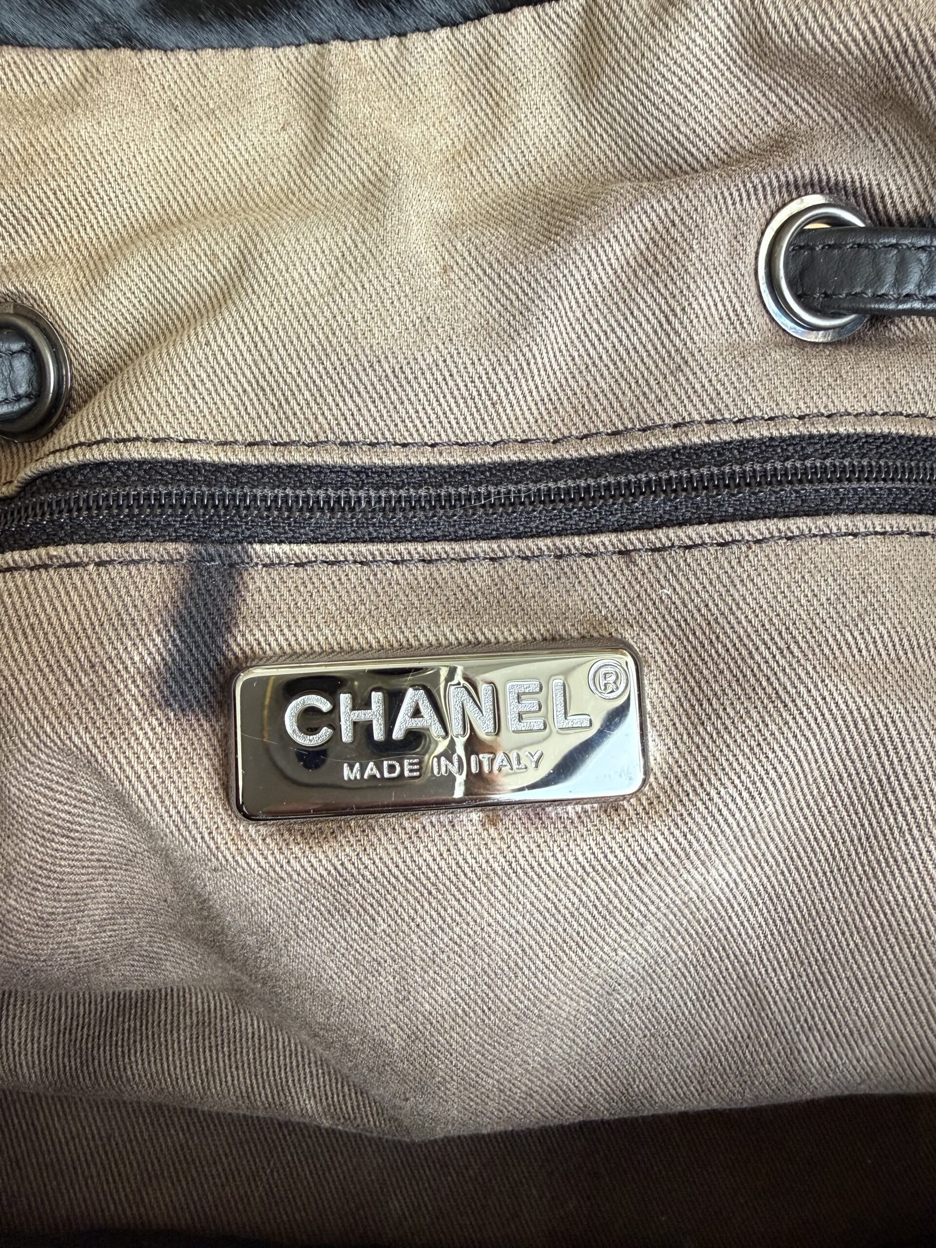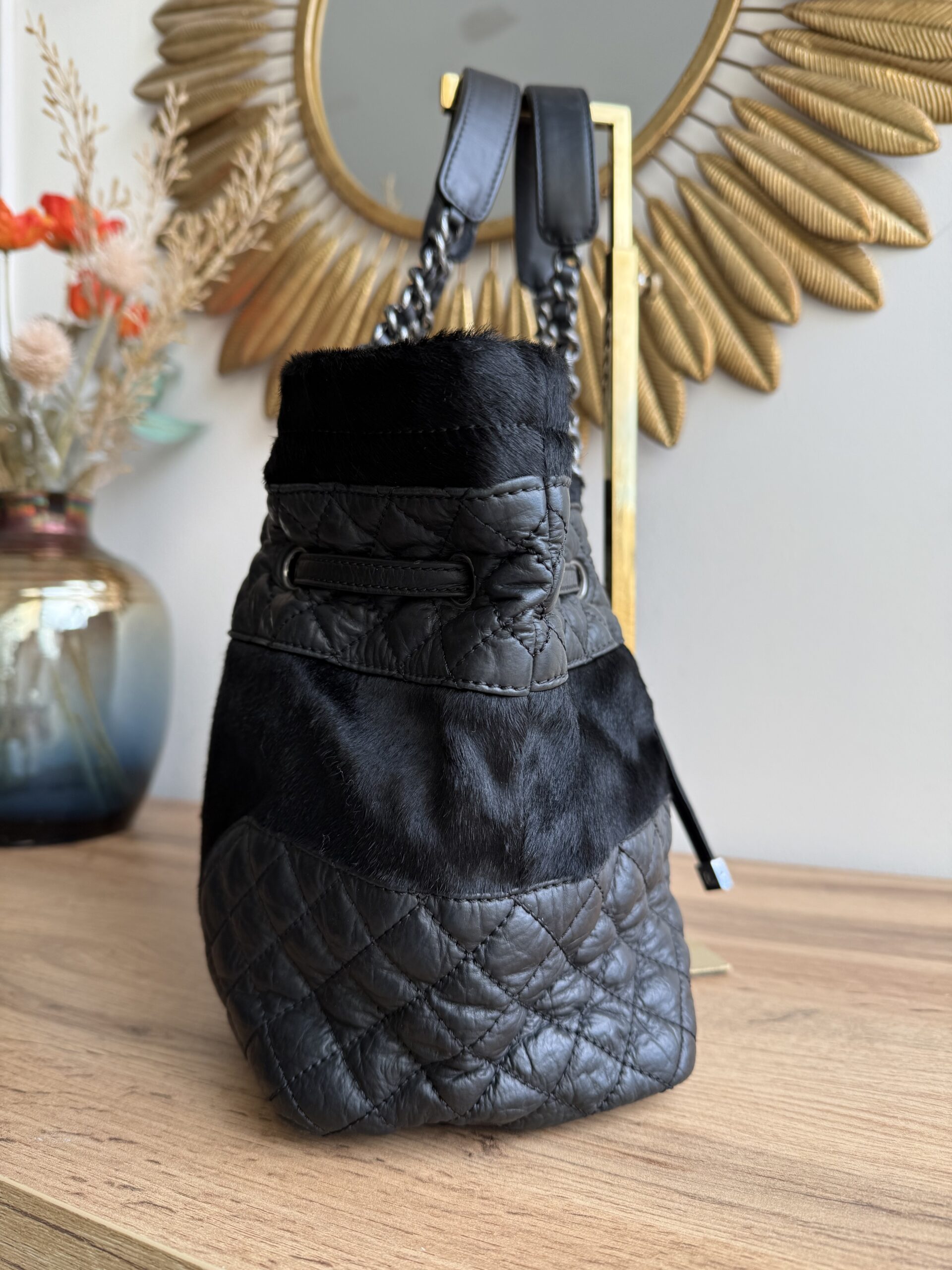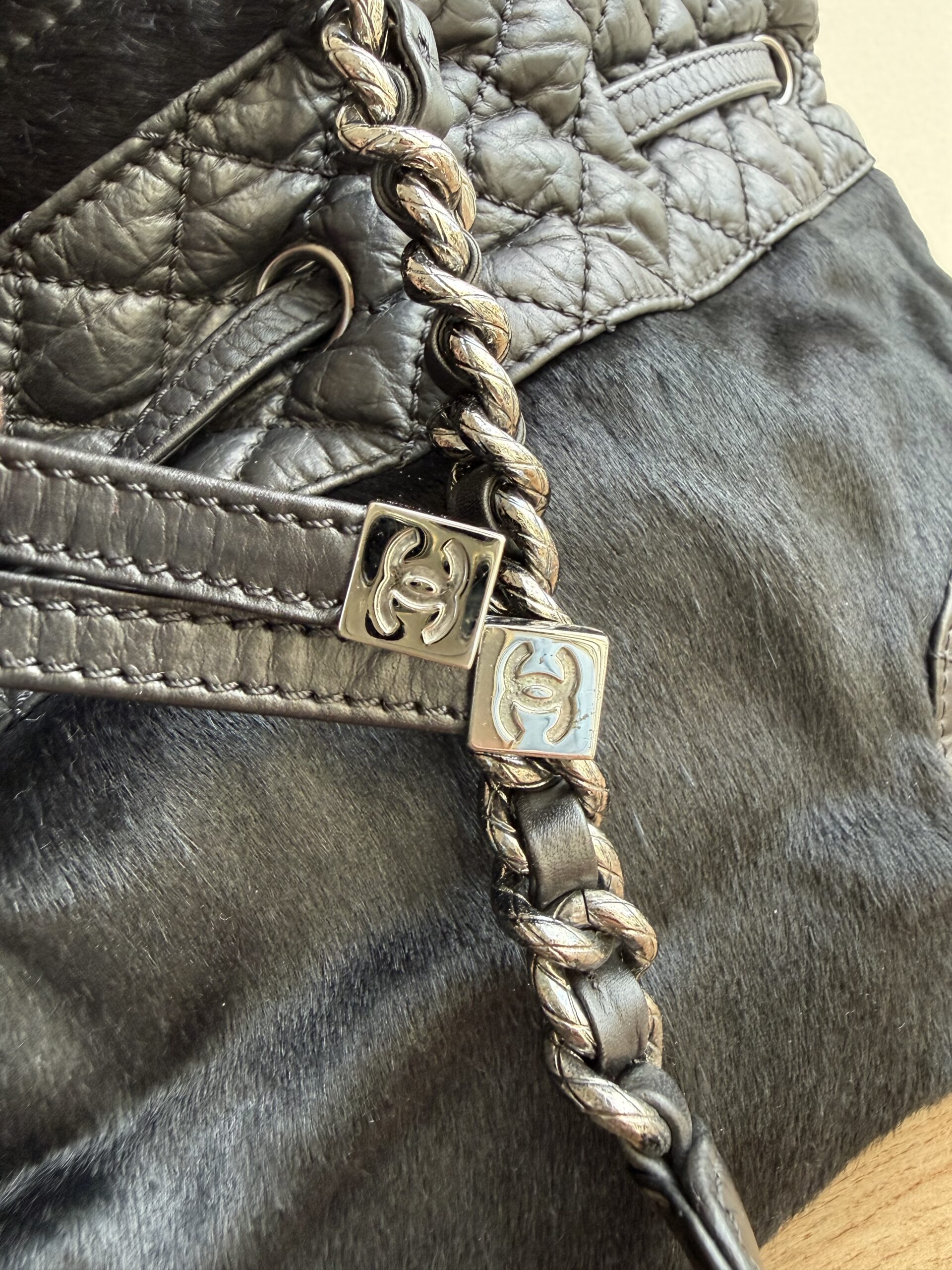 *Preloved* Crafted from a combination of pony-style calf hair and aged quilted leather with aged metal hardware, this bag features a drawstring closure with signature CC logo hardware at the and of the leather cord. This bag has one main compartment and one zipped inner pocket. This bag was manufactured between year 2005 and 2006. This bag comes with Chanel authenticity card and authenticated by Mevvah via Entrupy.