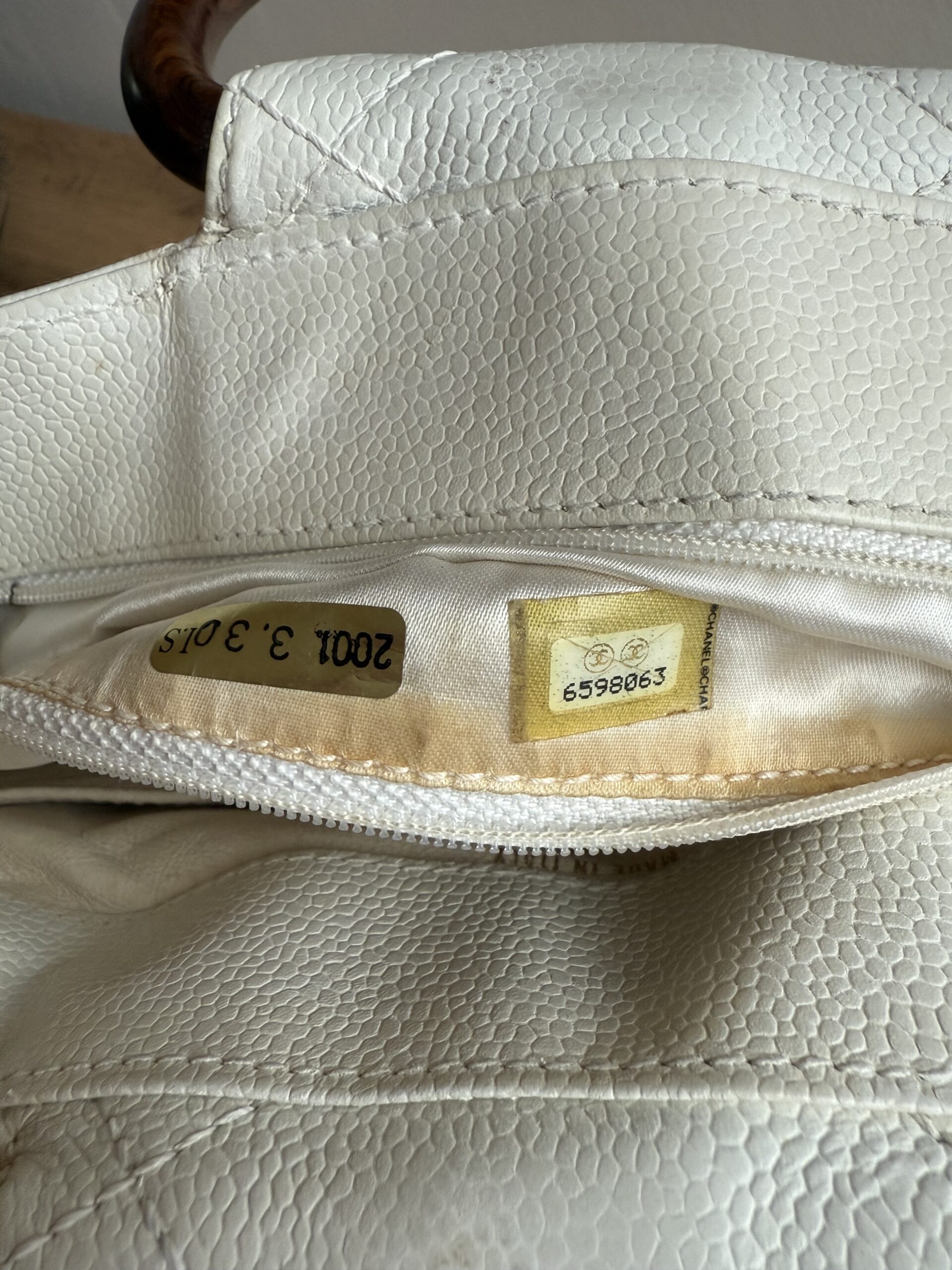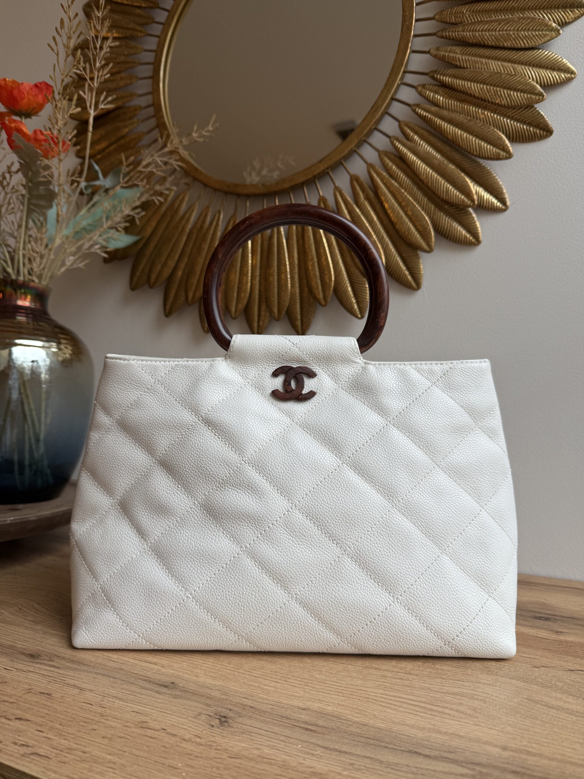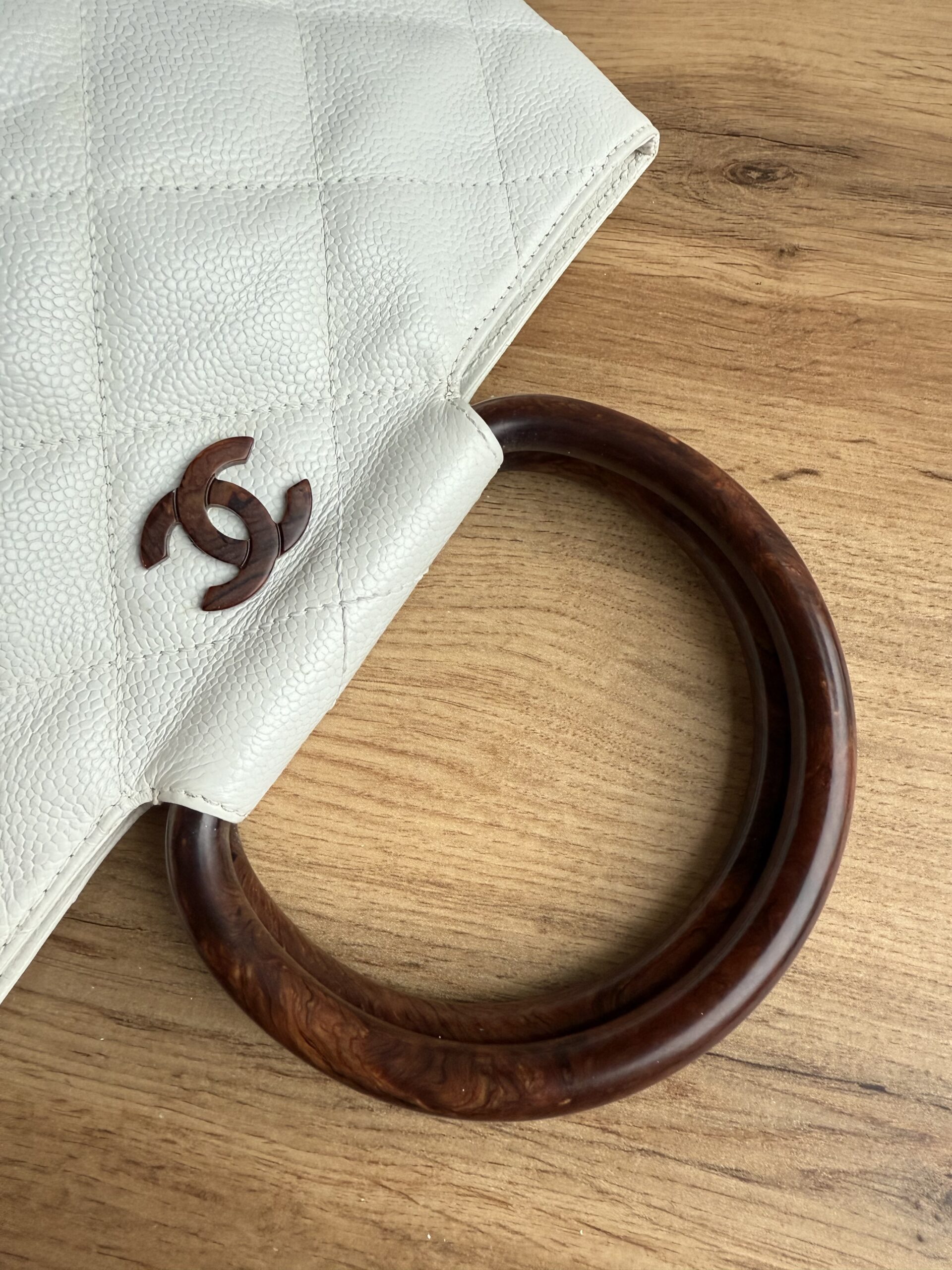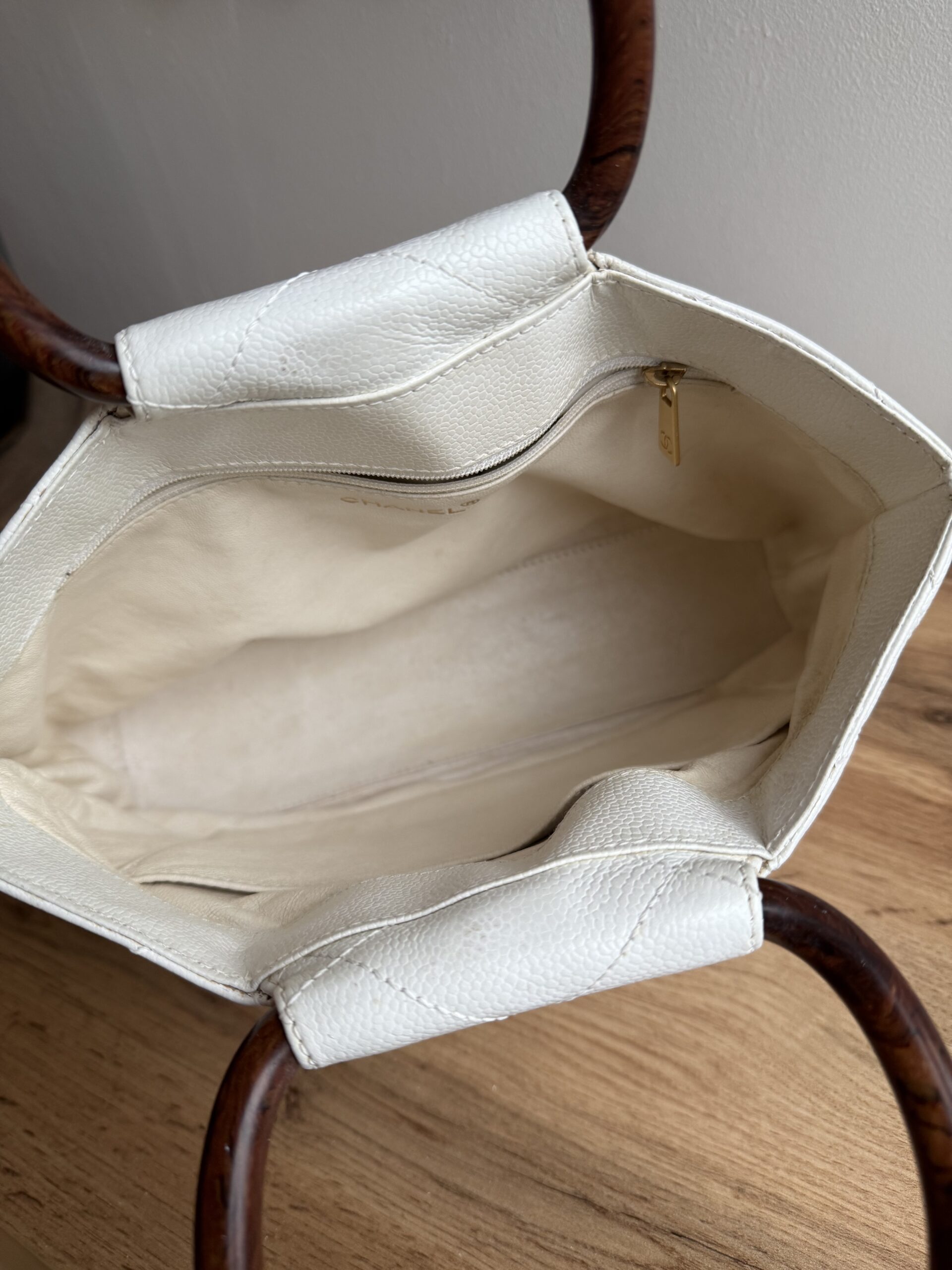 A sophisticated tote crafted from caviar leather with wooden handles. This piece is from the year 2001.