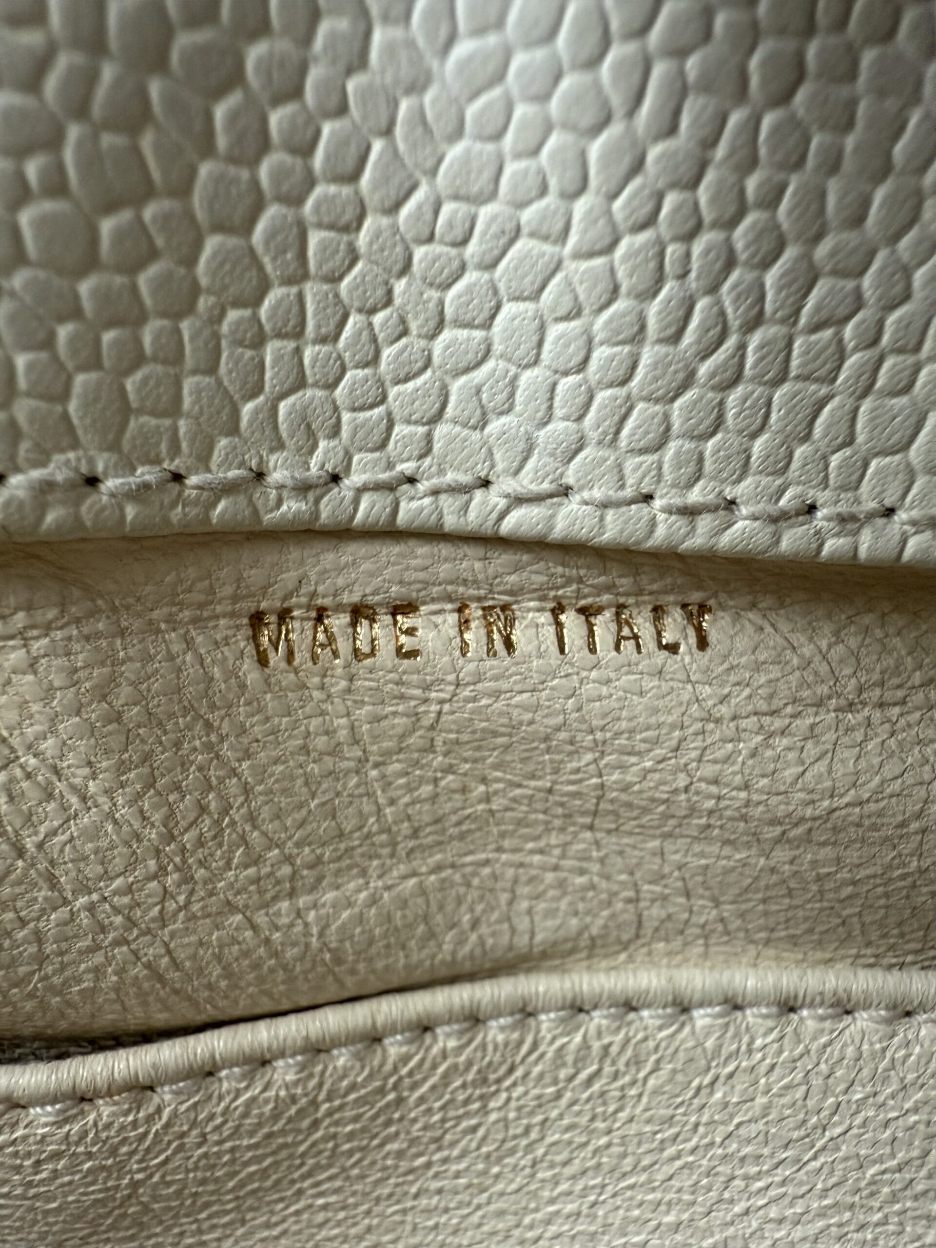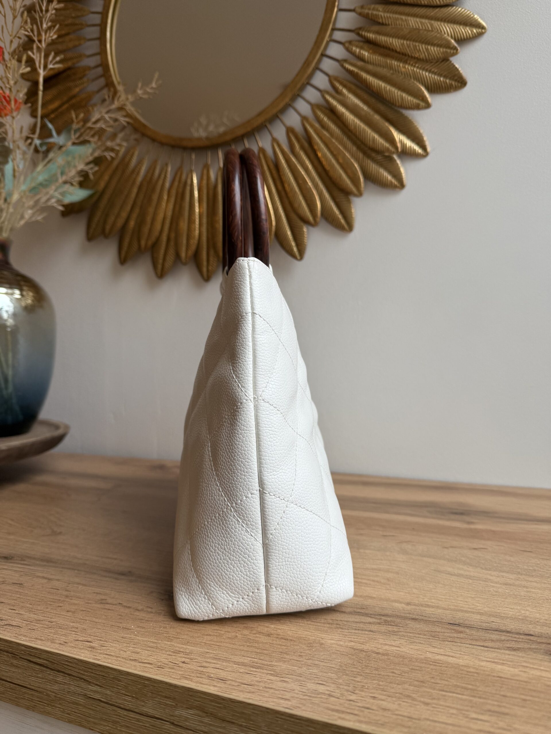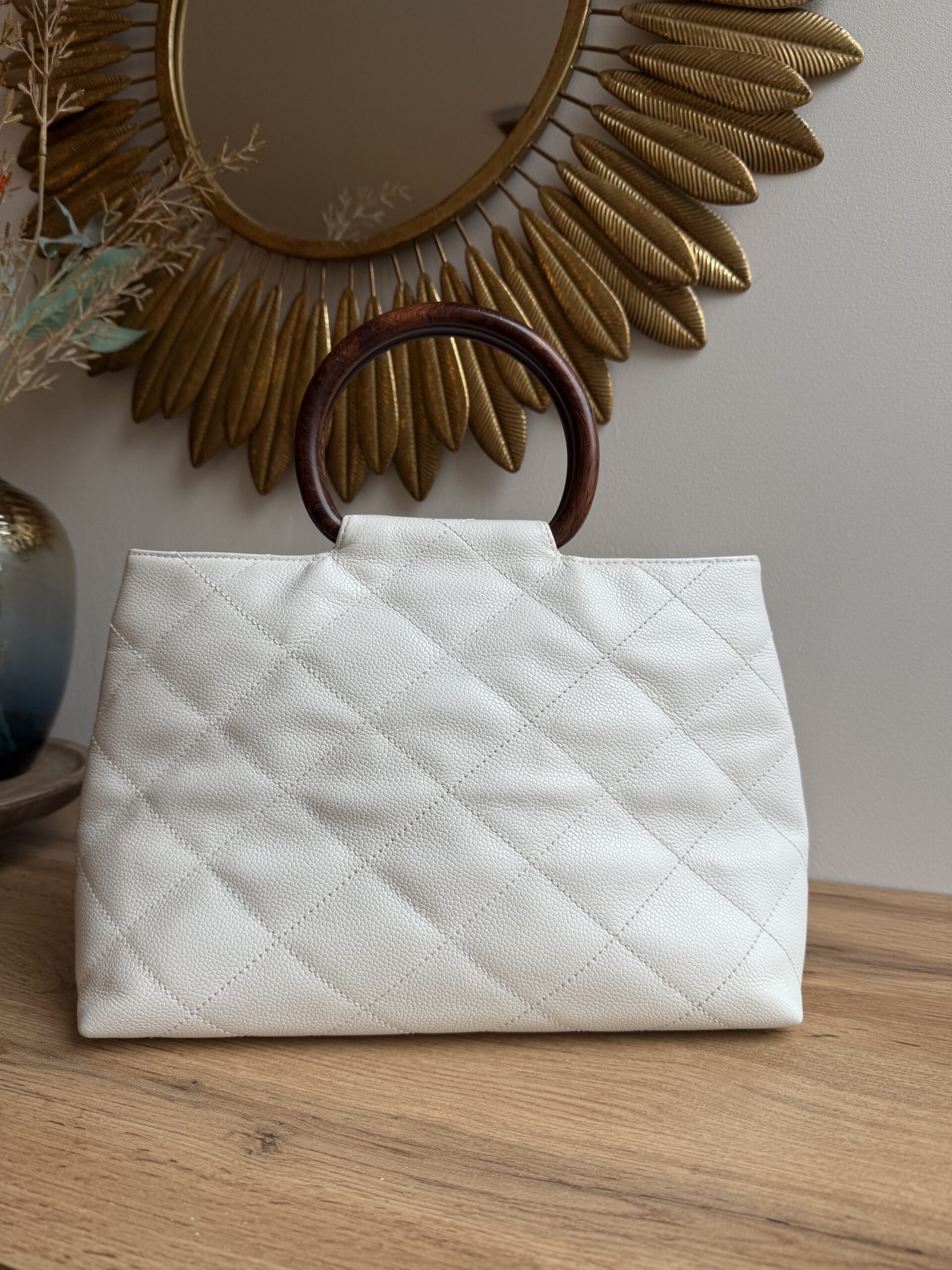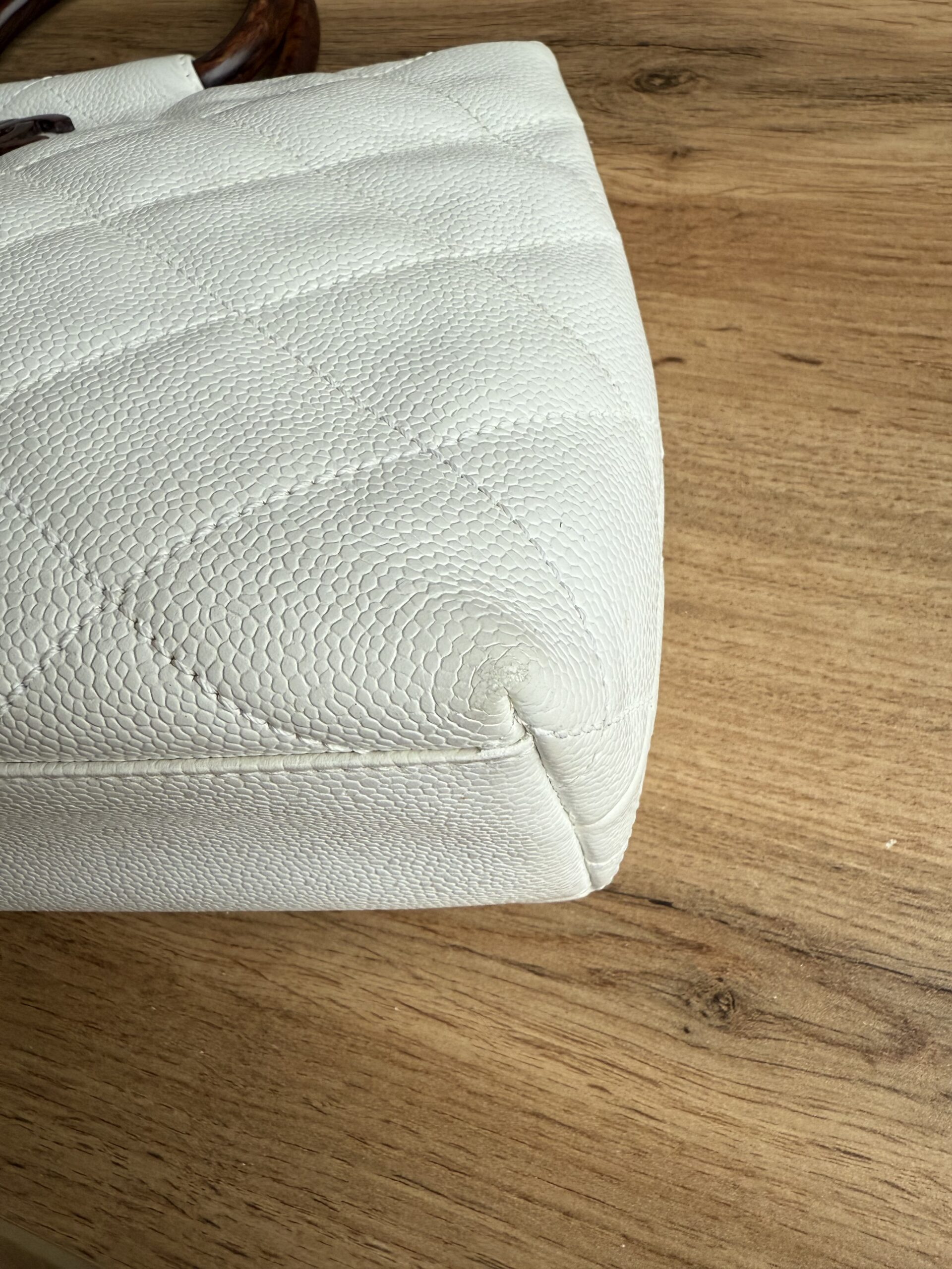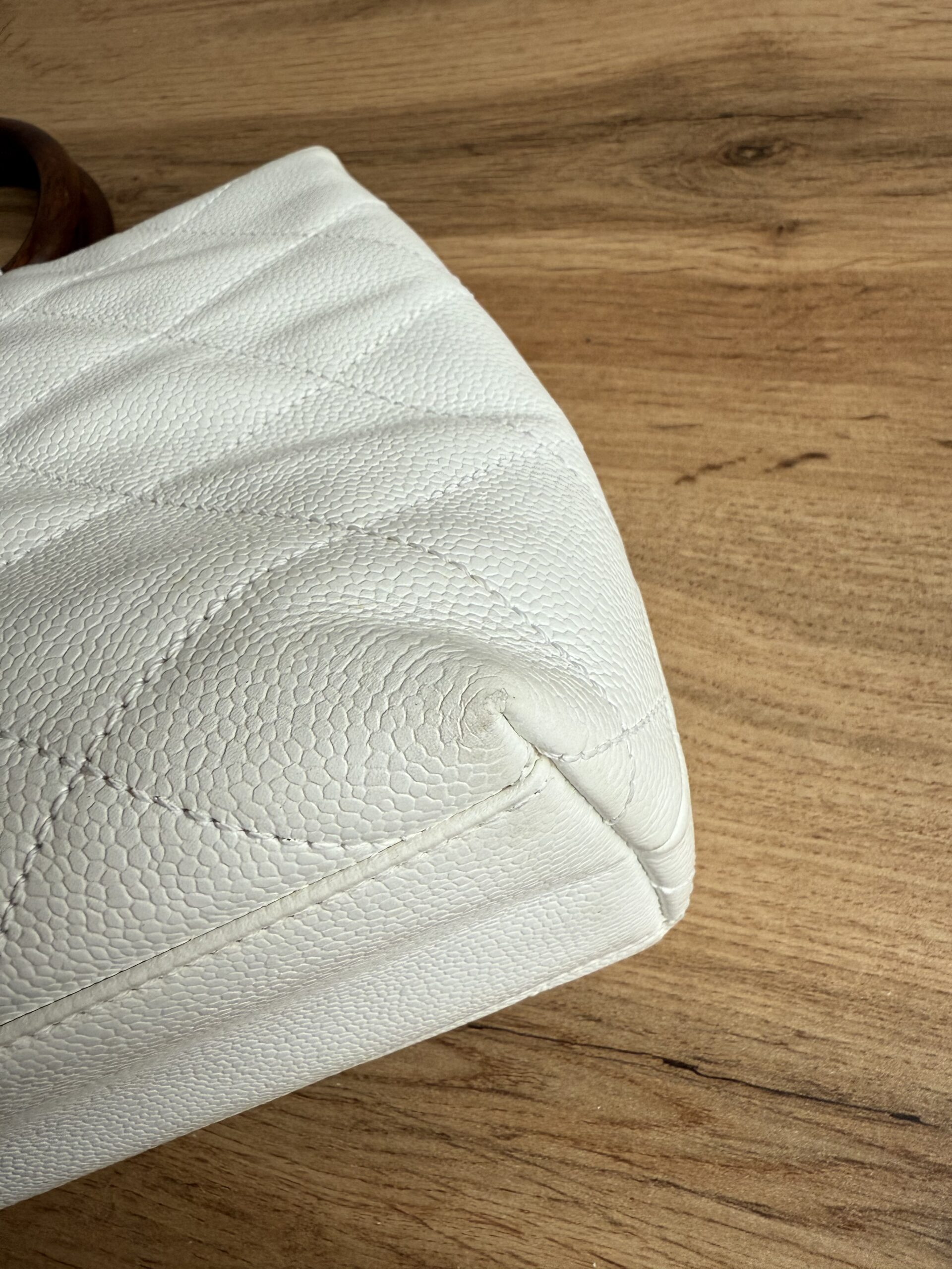 A sophisticated tote crafted from caviar leather with wooden handles. This piece is from the year 2001.