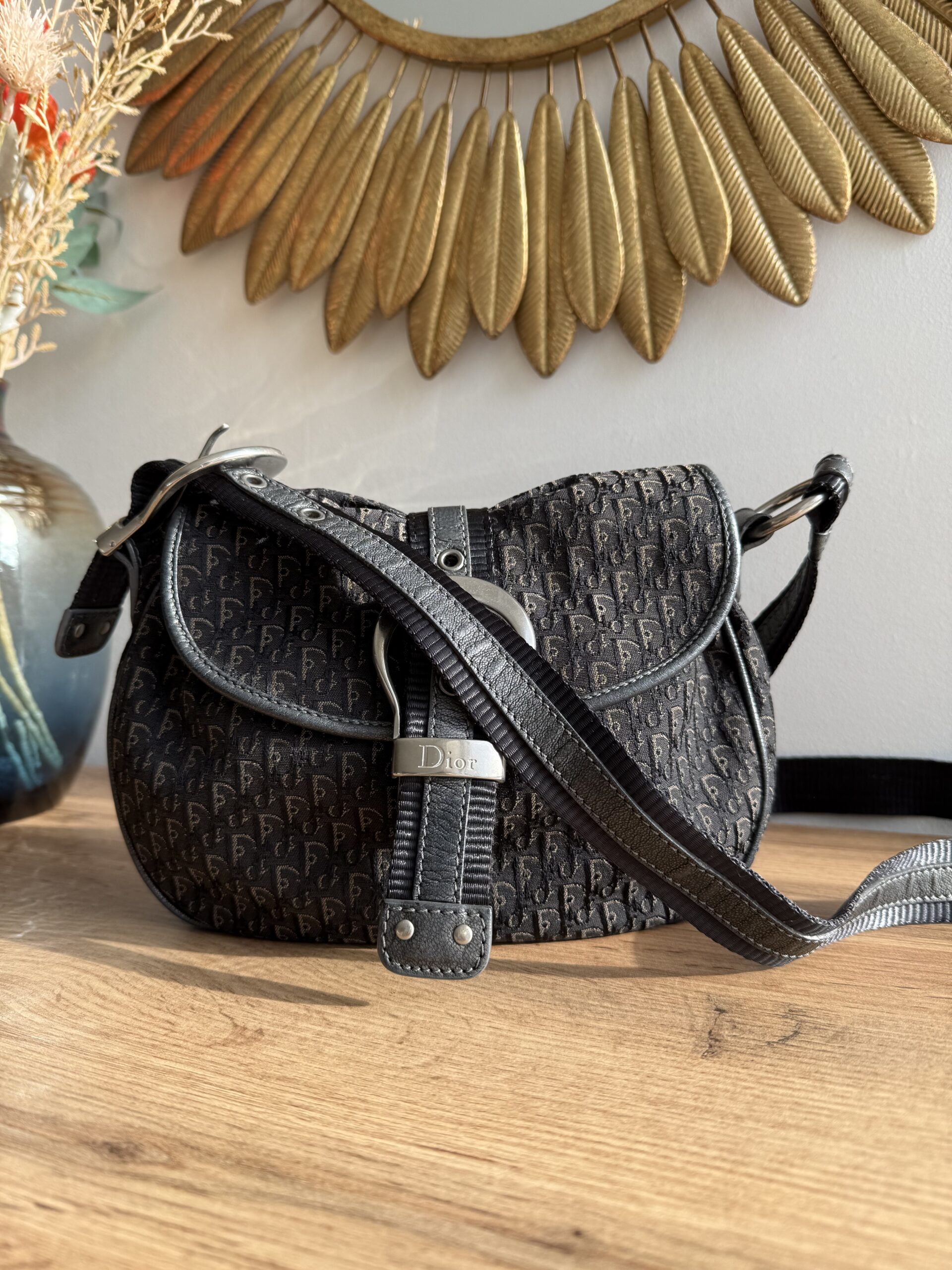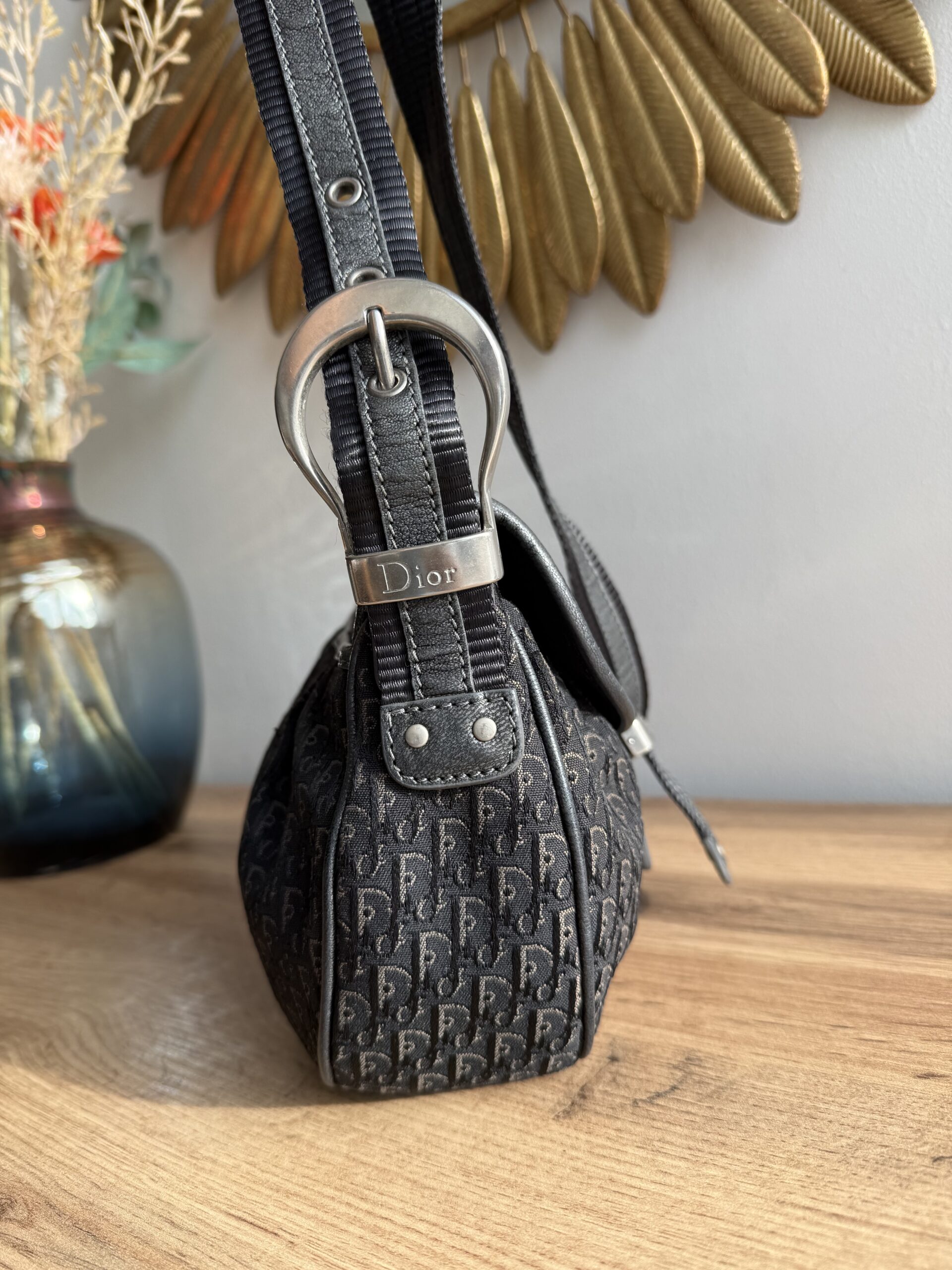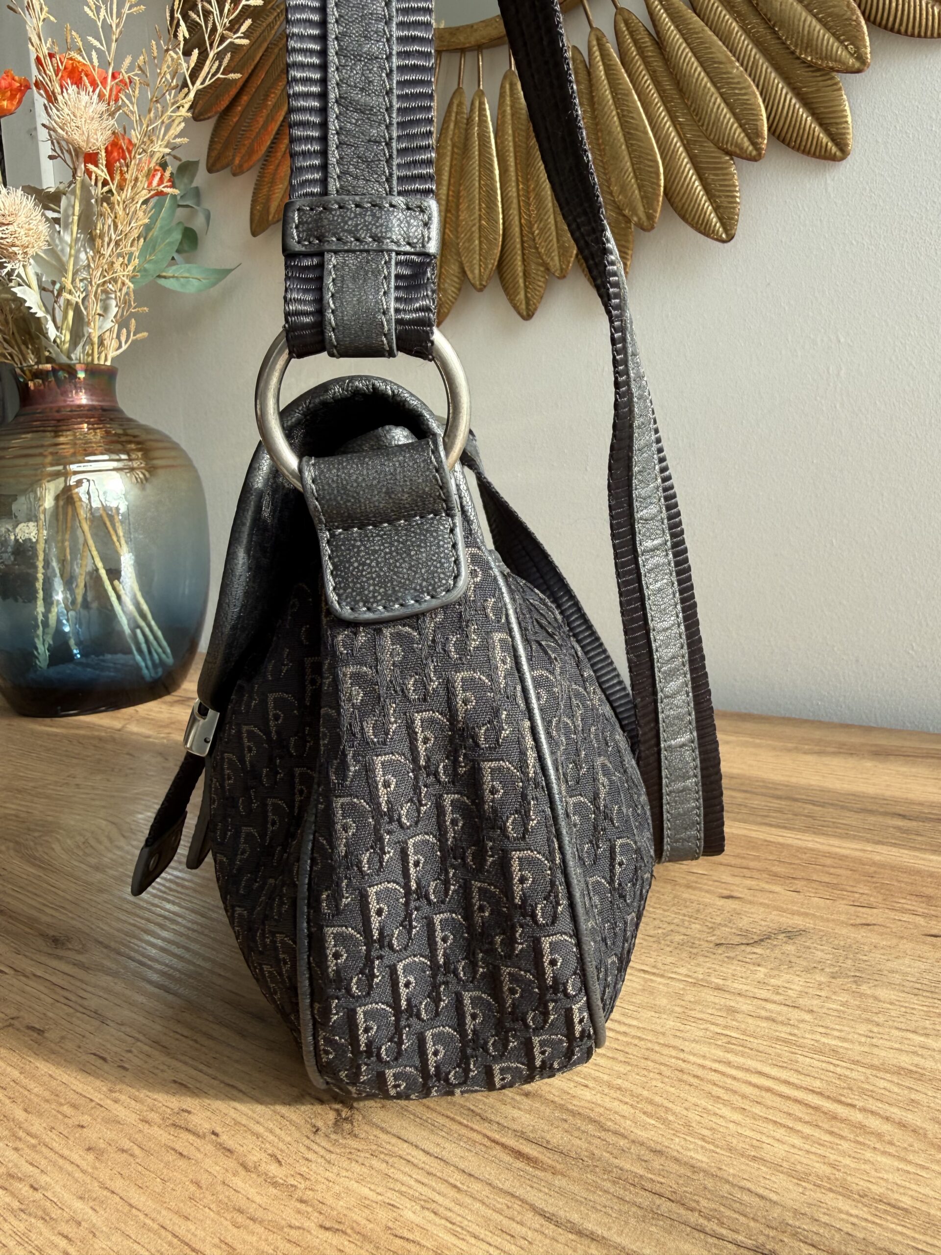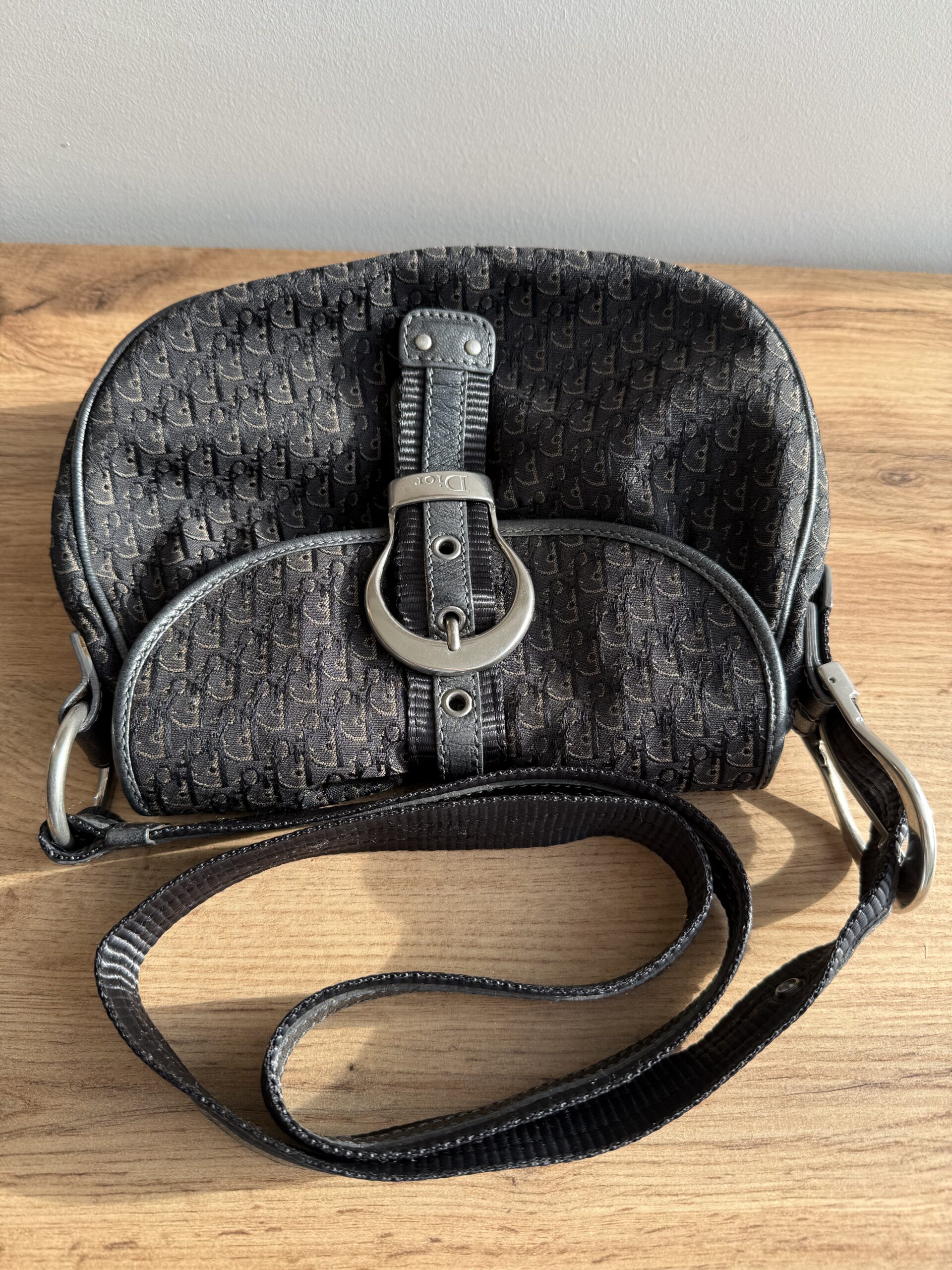 *Vintage* Features a classic saddle style shape with smooth curved lines and a flap closure. Crafted from Diorissimo canvas with leather trim and a prominent silver tone buckle hardware. This bag has one main compartment and one zipped inner pocket. The strap is adjustable.