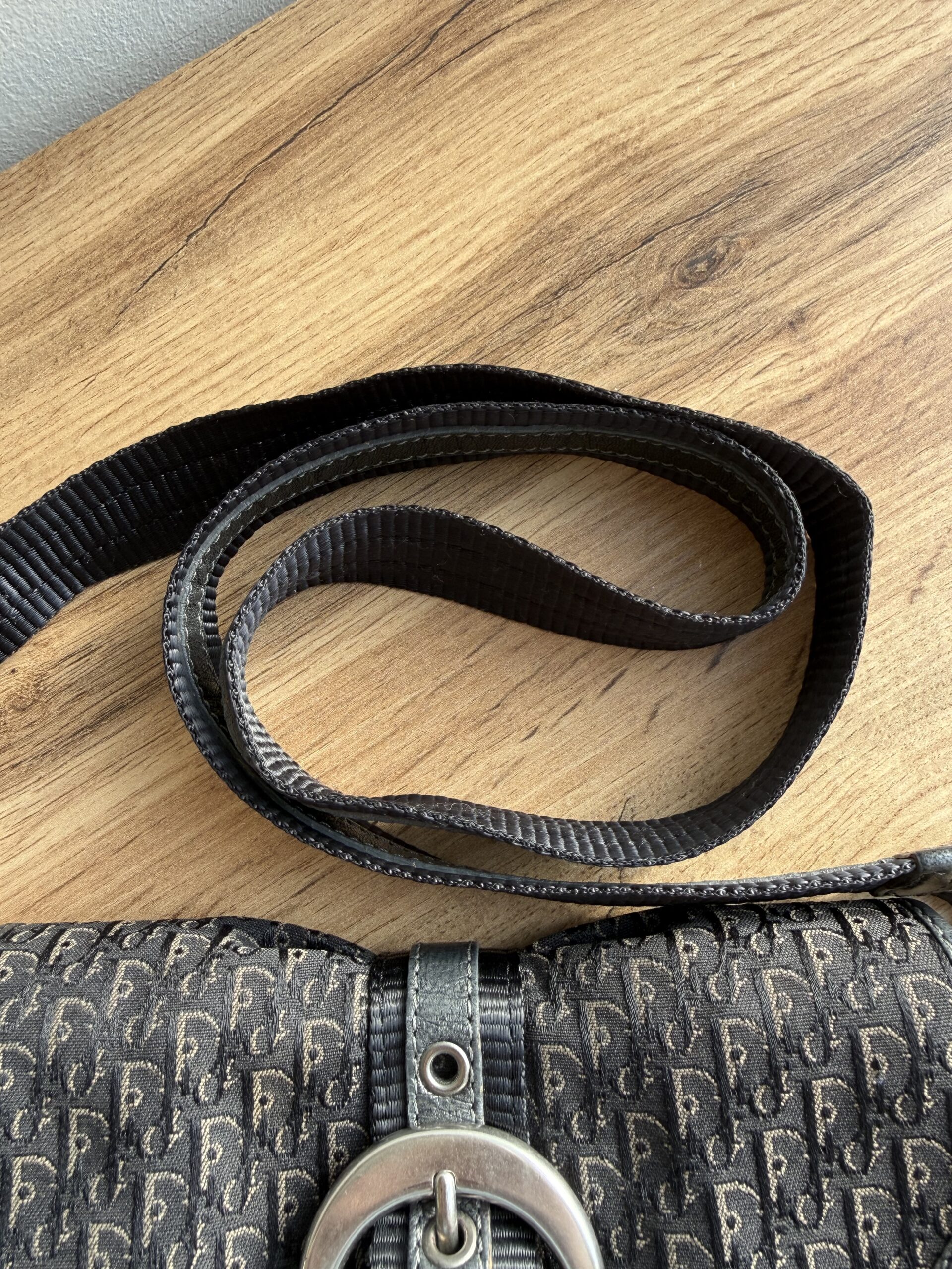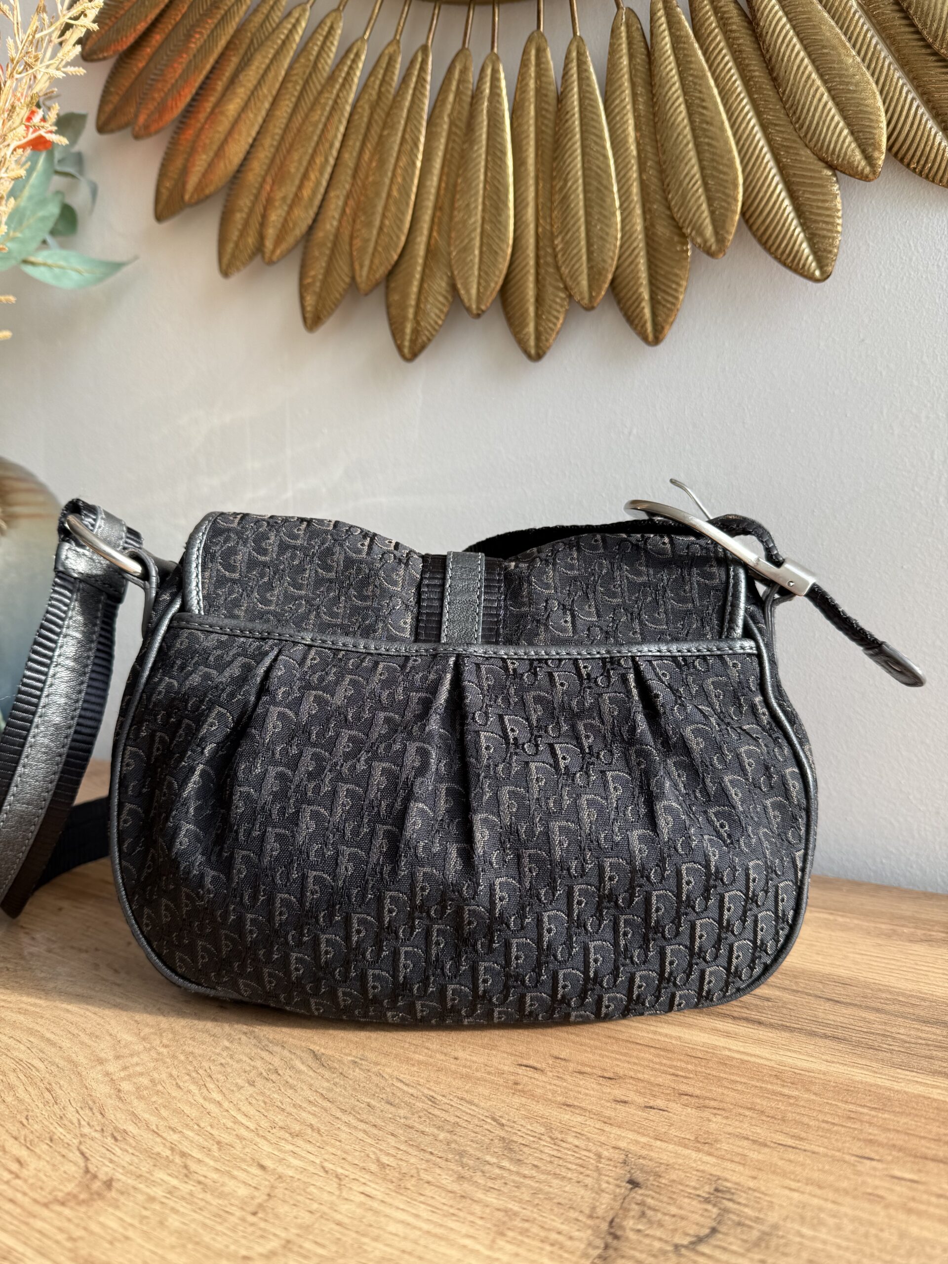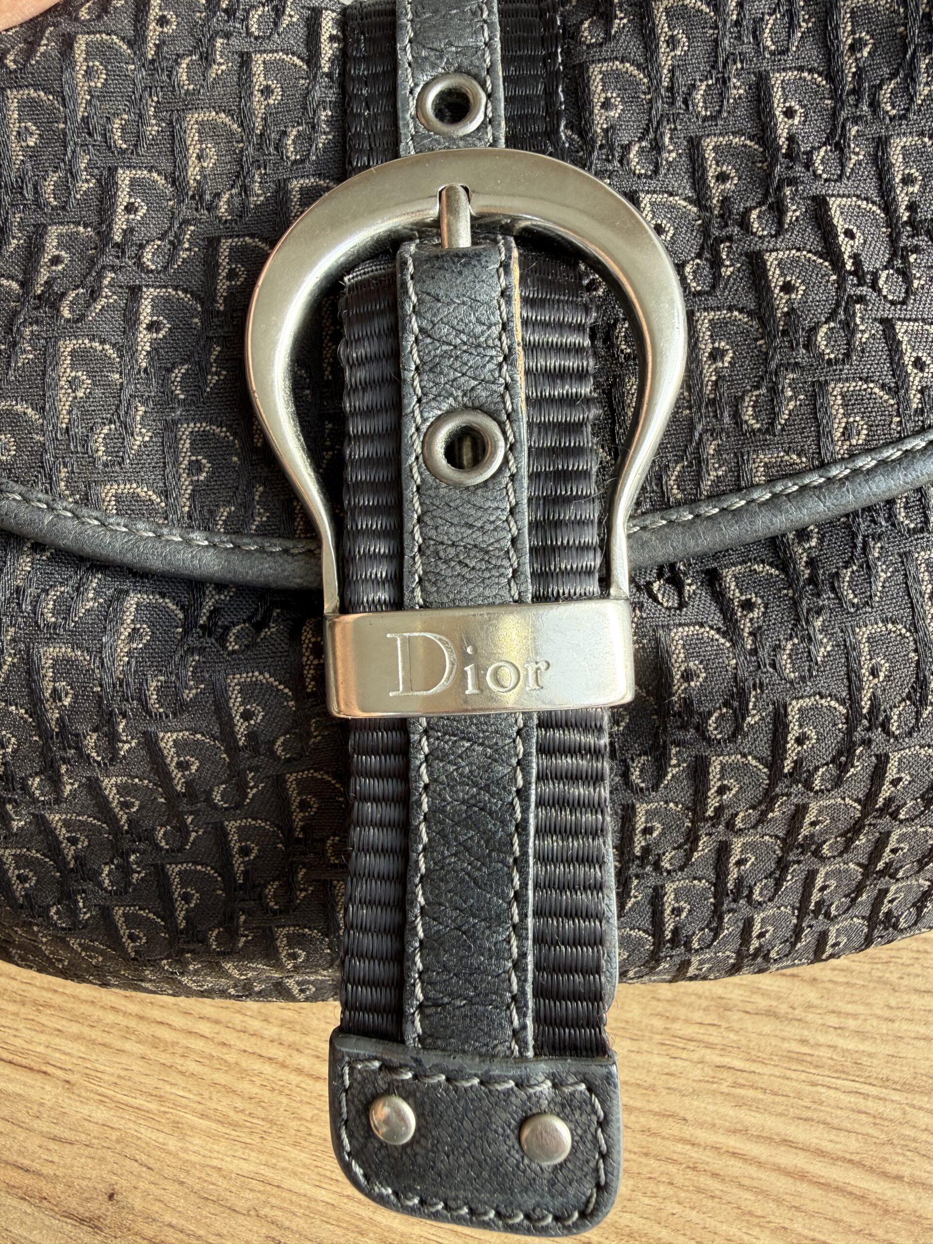 *Vintage* Features a classic saddle style shape with smooth curved lines and a flap closure. Crafted from Diorissimo canvas with leather trim and a prominent silver tone buckle hardware. This bag has one main compartment and one zipped inner pocket. The strap is adjustable.