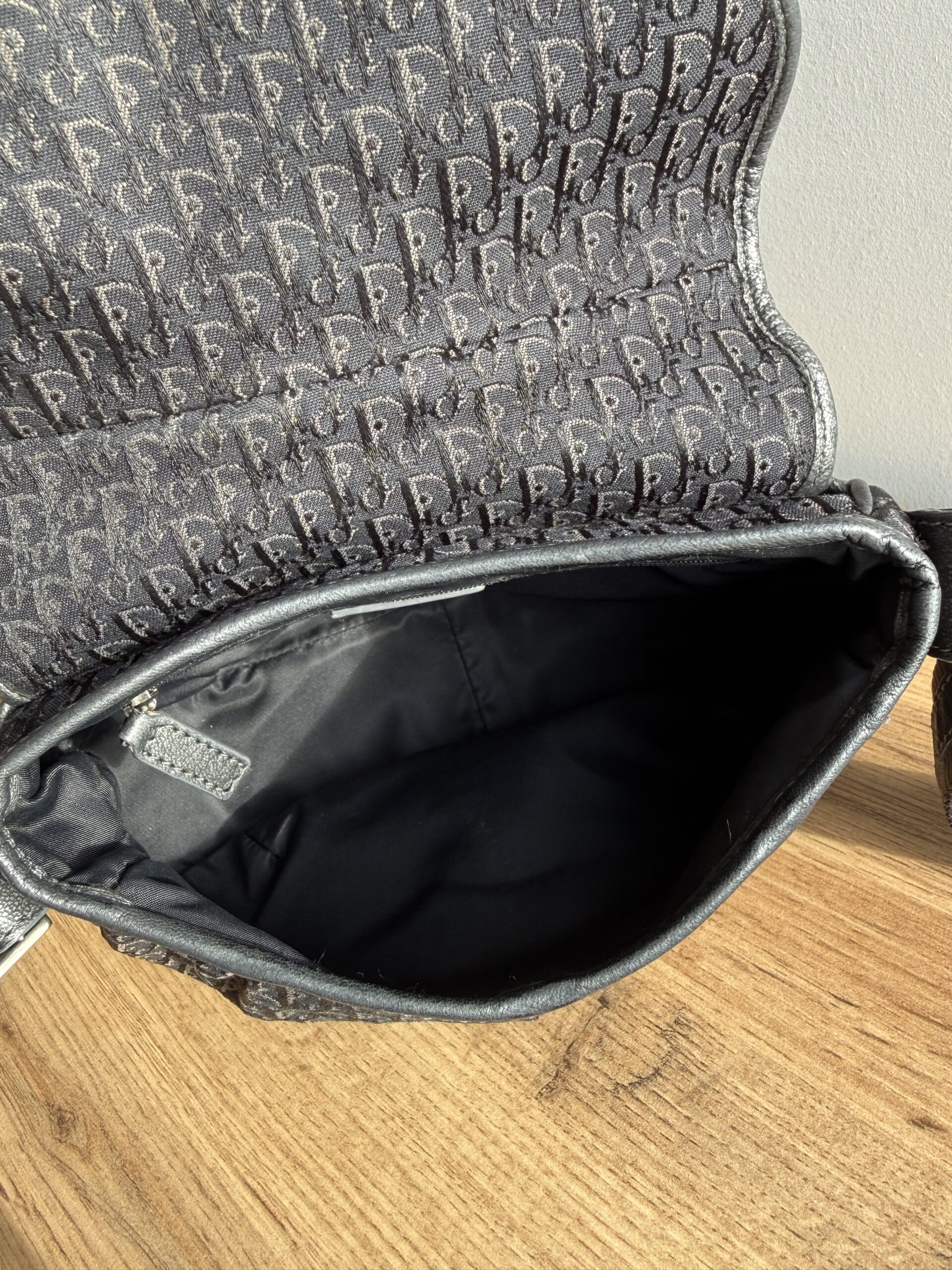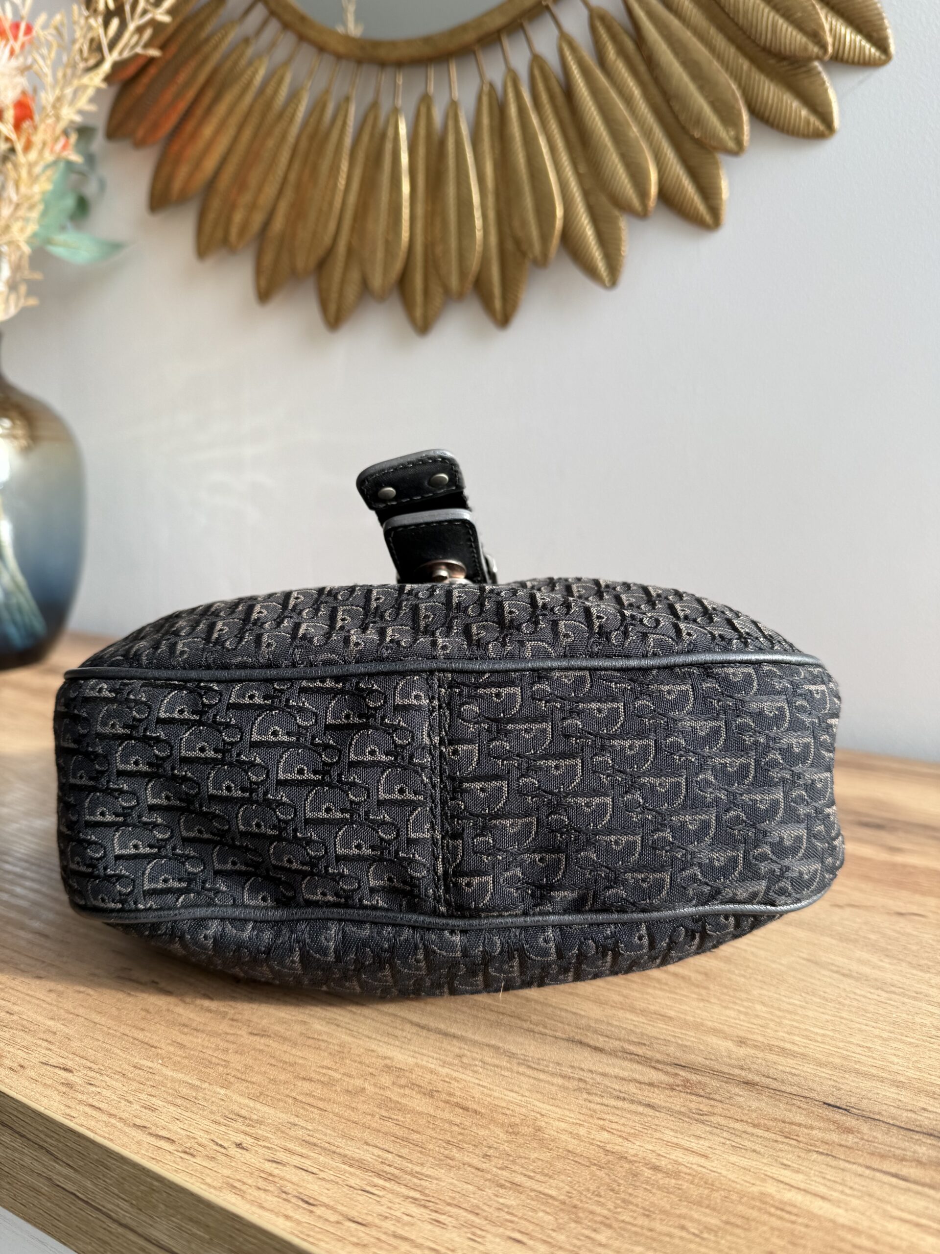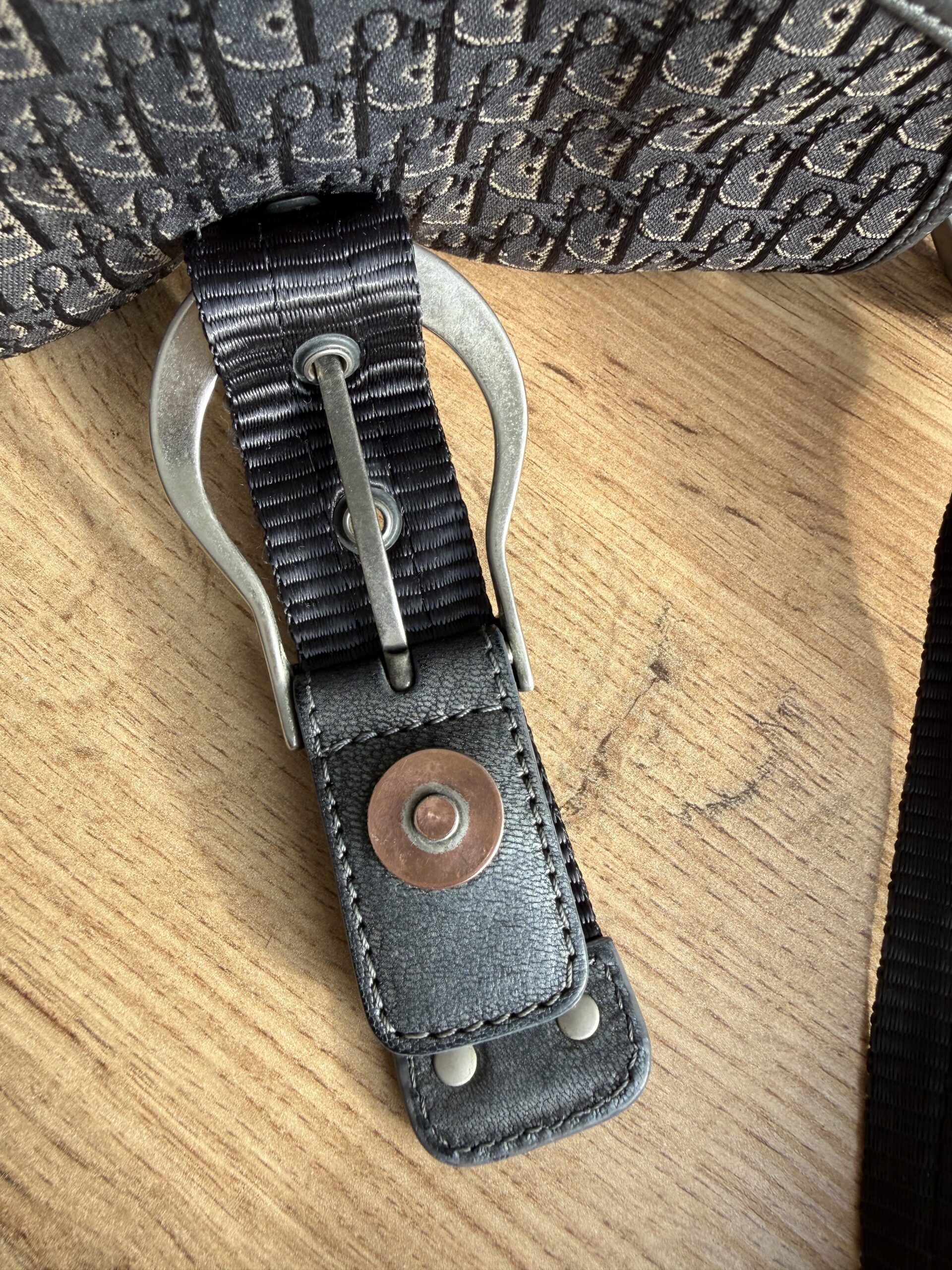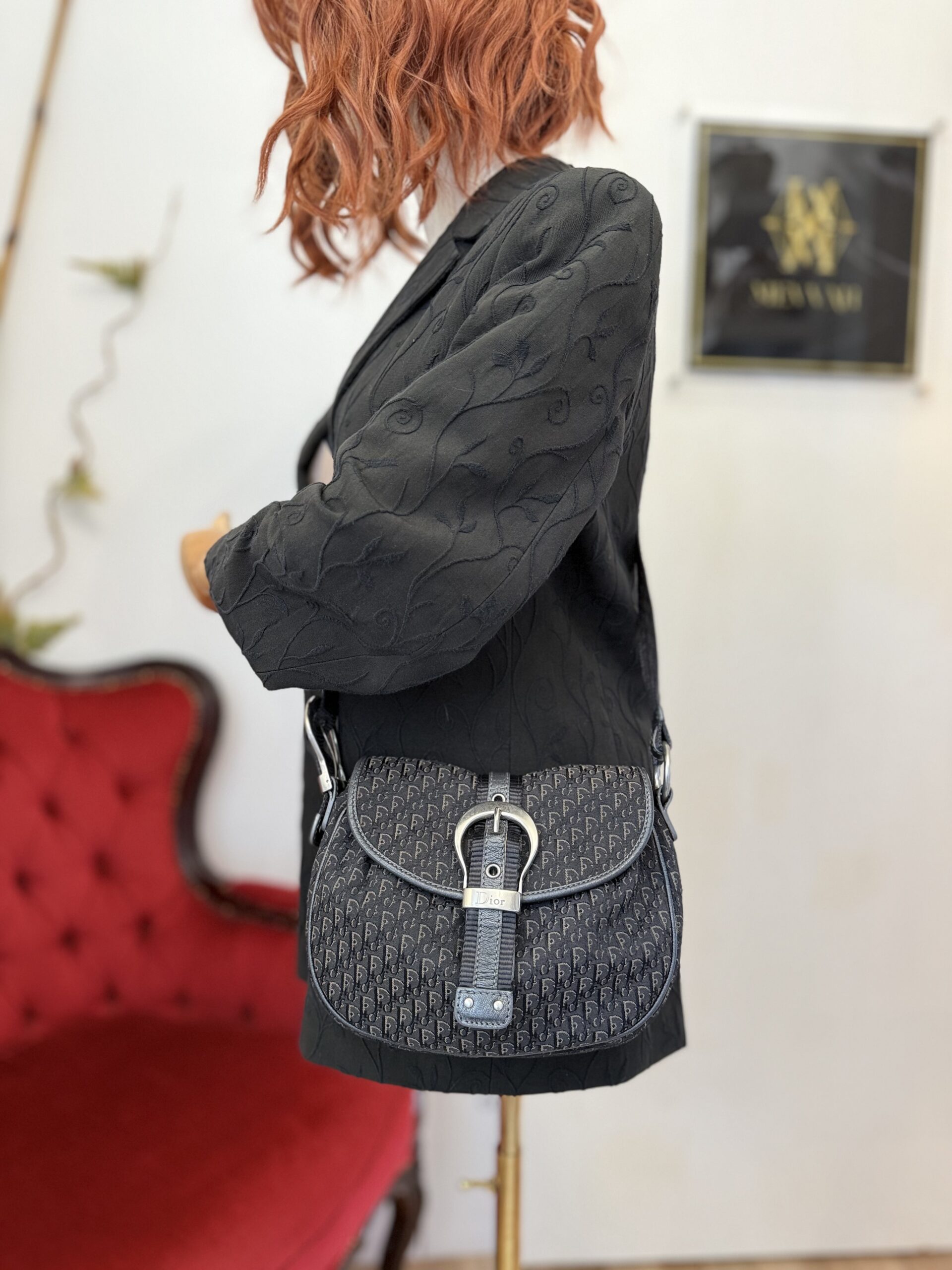 *Vintage* Features a classic saddle style shape with smooth curved lines and a flap closure. Crafted from Diorissimo canvas with leather trim and a prominent silver tone buckle hardware. This bag has one main compartment and one zipped inner pocket. The strap is adjustable.