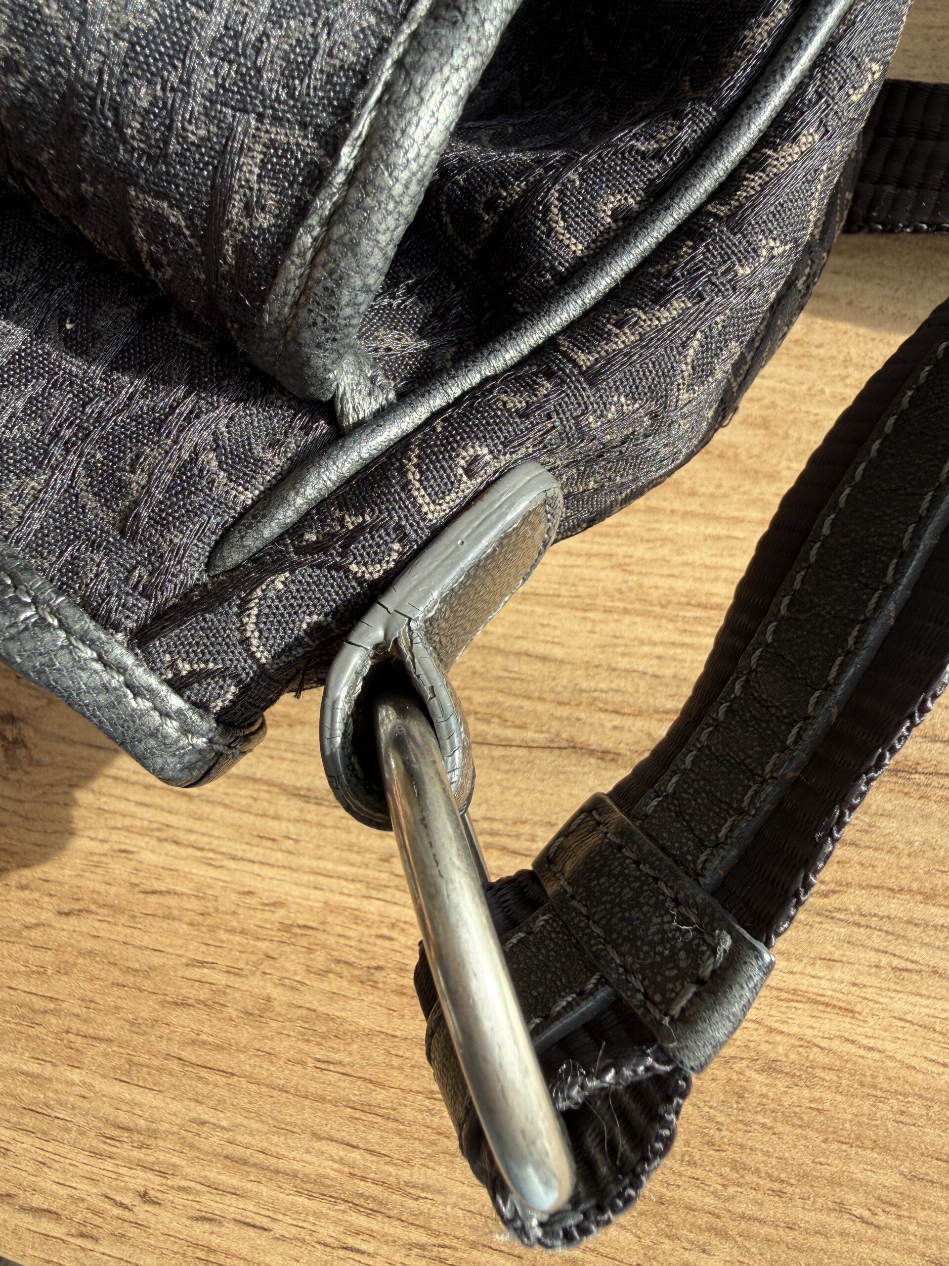 Condition: good, hardware partially scratched and tarnished, little cracks on the leather edges