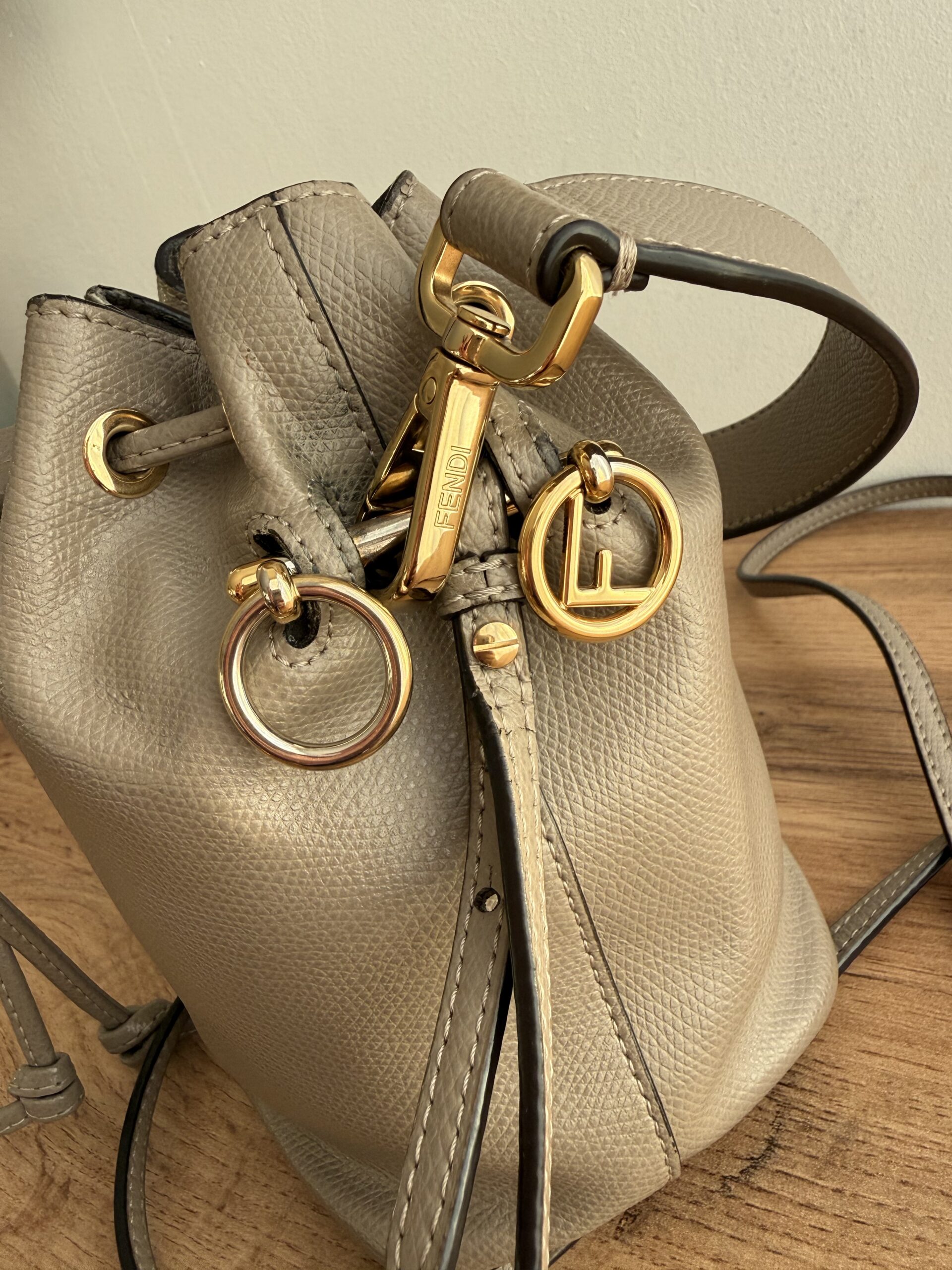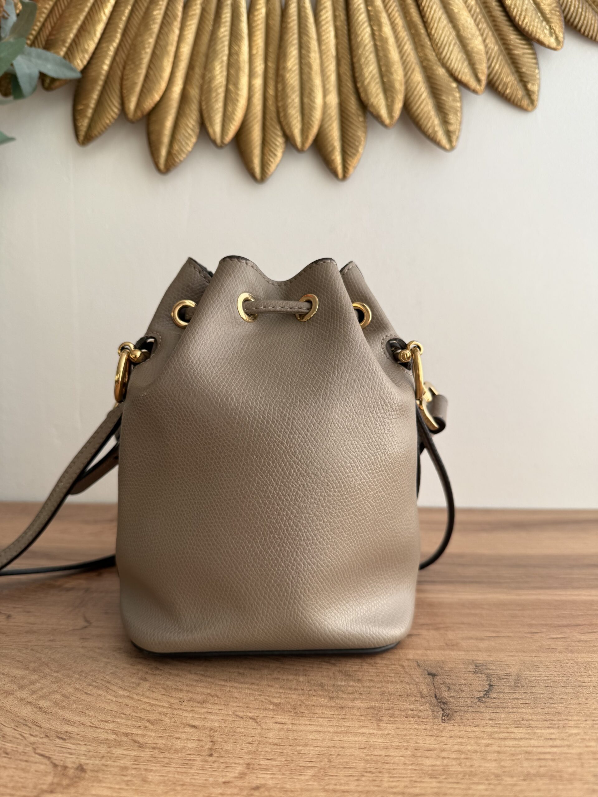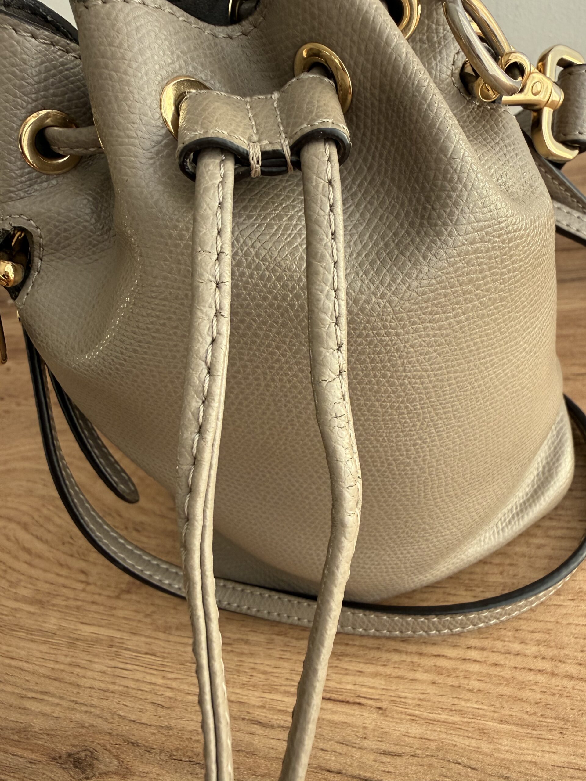 Crafted for taupe calfskin leather. This bag features drawstring closure, a top handle and adjustable & removable shoulder strap for versatile carrying options.