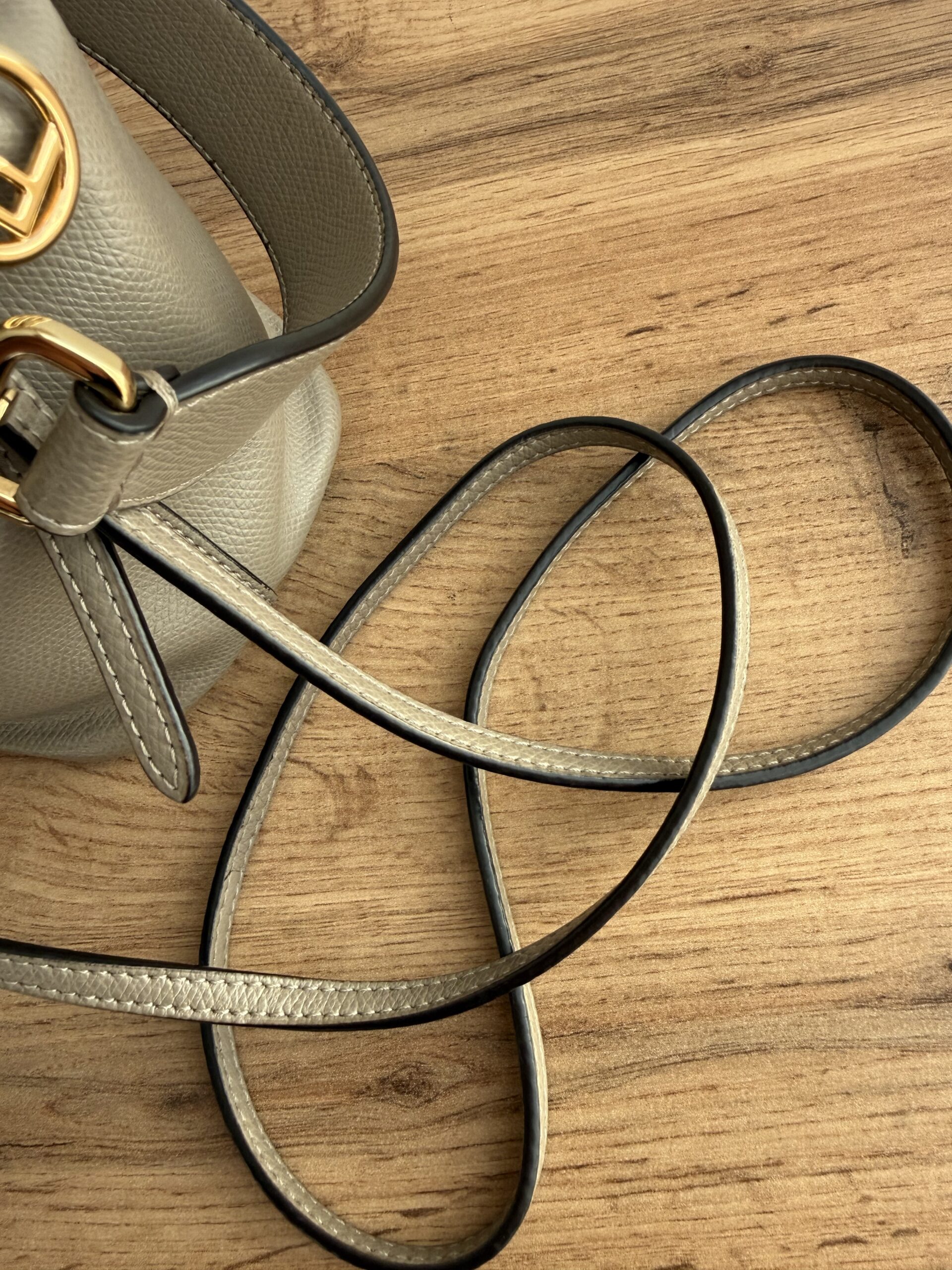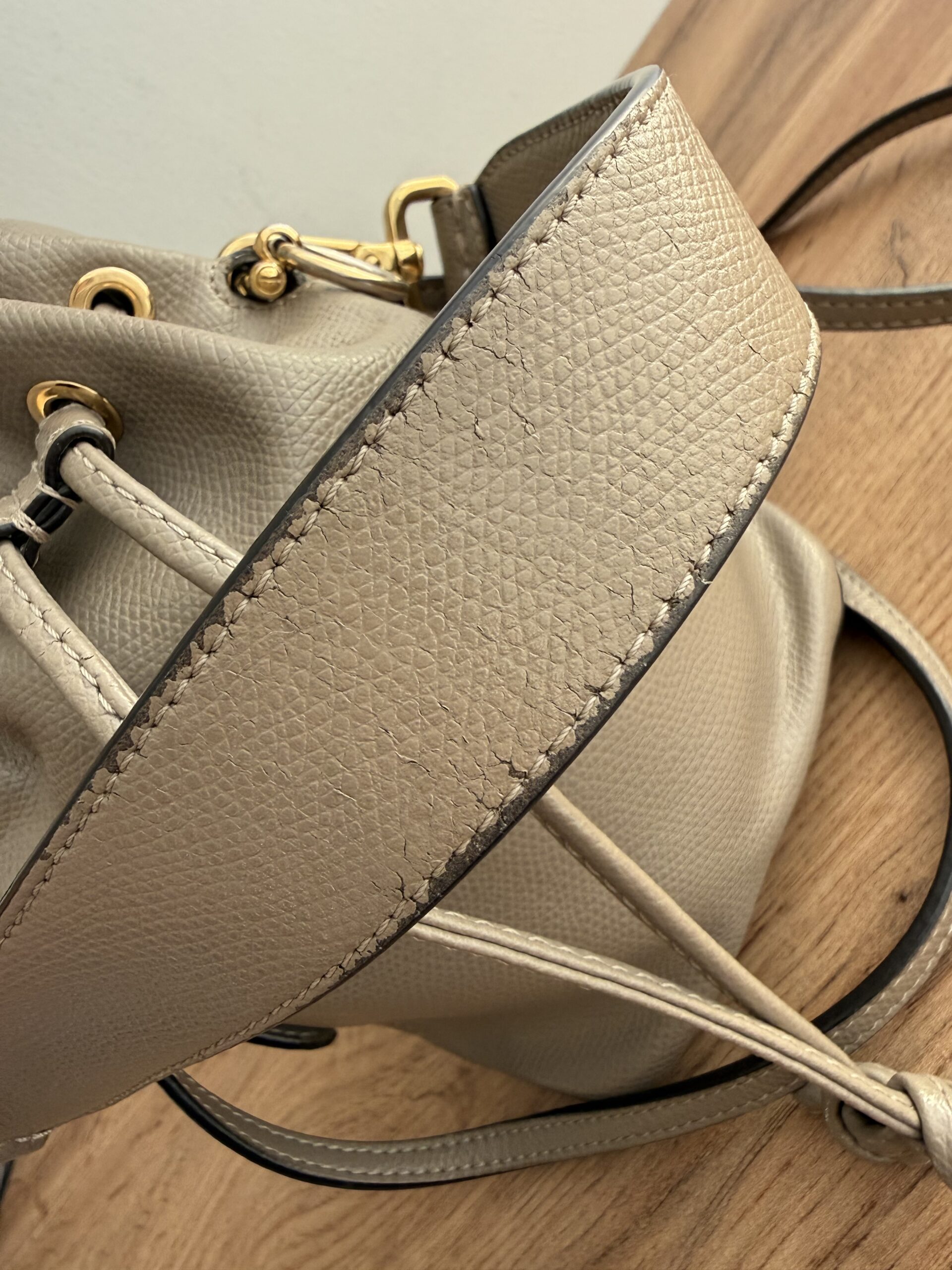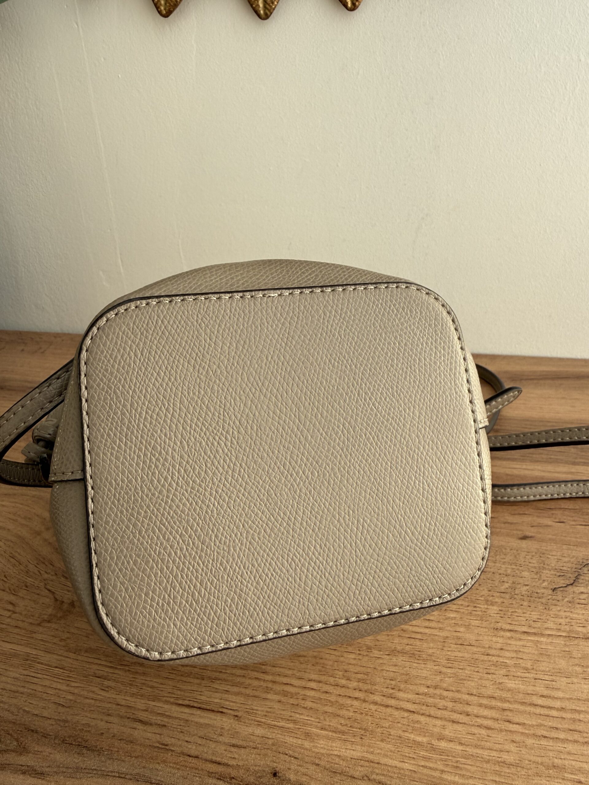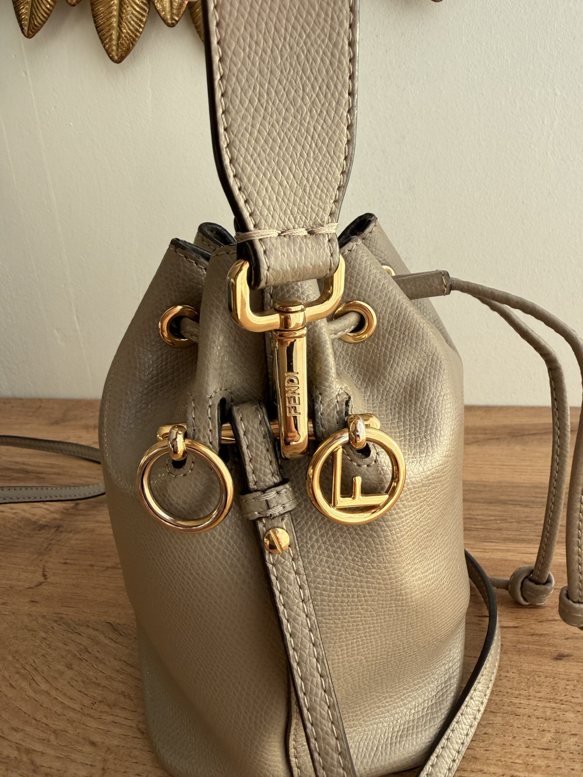 Crafted for taupe calfskin leather. This bag features drawstring closure, a top handle and adjustable & removable shoulder strap for versatile carrying options.